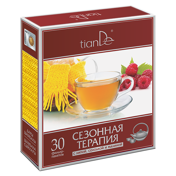 Фиточаи TianDe, изготовлены из дикорастущих растений Алтая. Описание: Фиточай «Сезонная терапия с липой, солодкой и малиной» поможет встретить во всеоружии любой сезон! Он укрепит иммунитет и позволит... Показать описание тебе отлично себя чувствовать даже в самую промозглую и сырую погоду. Напиток на 100% состоит из натурального сырья – алтайских плодов и трав-дикоросов. Выращенные в экологически чистом районе, они отдают чаю максимум пользы. Комплекс активных компонентов со знаменитыми «противокашлевыми» растениями не даст простуде взять тебя за горло. Современная технология обработки трав позволяет сохранить и передать напитку максимальное количество ценных веществ. Надежная трехслойная упаковка фильтр-пакетов, включающая саше, коробку и пленку, помогает сохранить витамины, макро- и микроэлементы растений. Применение: 1 фильтр-пакет залить 1 стаканом горячей воды (75–80 C). Настоять 5–10 минут. Можно добавить мед или лимон по вкусу.