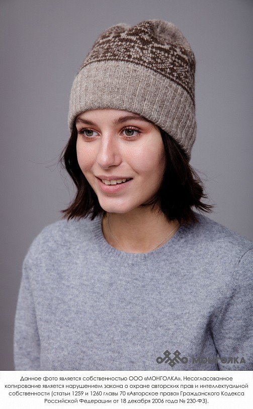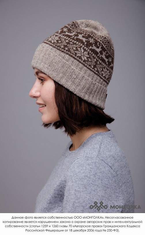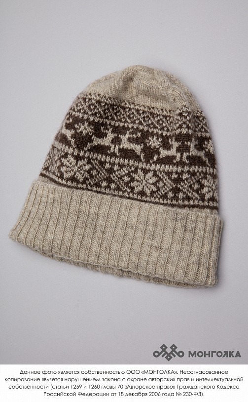 Шапка из монгольской овечьей шерсти сохраняет тепло в любые морозы, но для выполнения этой функции следует обращать внимание на состав изделия. Теплая шапка, в составе которой 100% шерсть монгольской ... Показать описаниеовцы, отводит лишнюю влагу и подарит чувство сухости и комфорта в холодную погоду. Шерстяная шапка дополнит любой образ и может стать согревающим подарком для близкого человека. В нашем ассортименте вы найдете еще больше товаров из натуральной шерсти, доставленных напрямую из Монголии. Производитель: Монголия, TOD Состав: 100% шерсть монгольской овцы Цвет: шоколадный с орнаментом Размер: ОГ 56-58 см. Ширина: 26 см. Двойная вязка Можно носить с подворотом