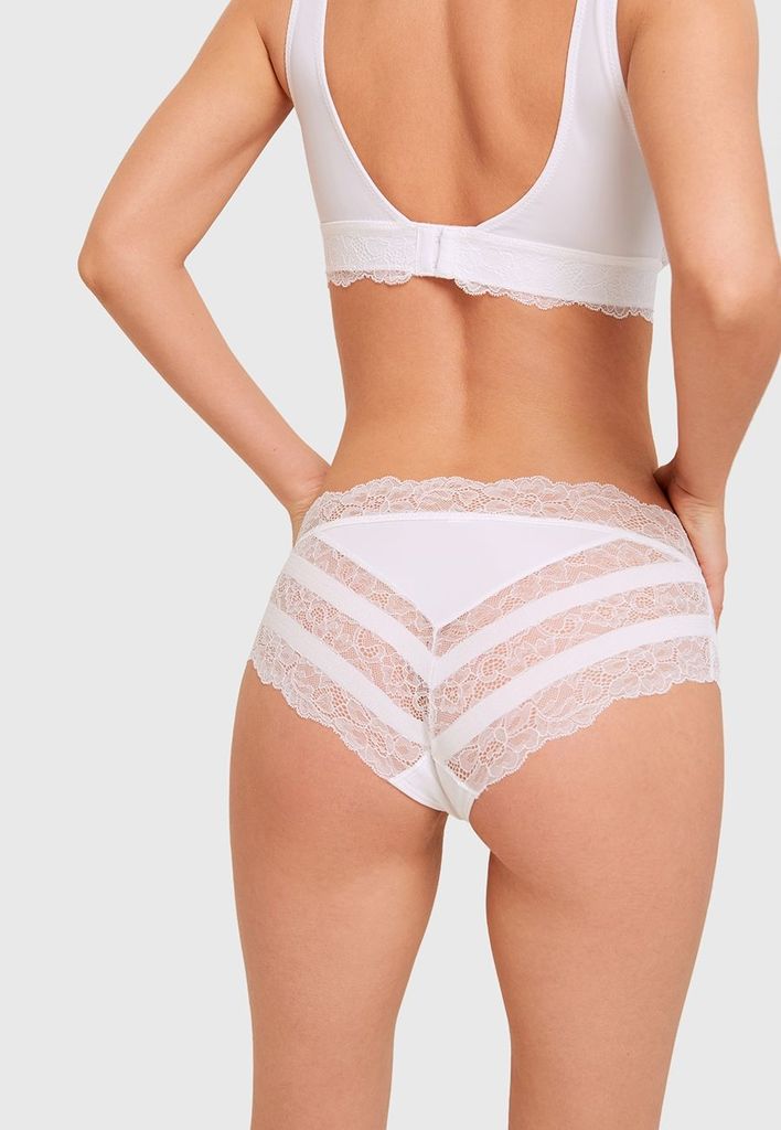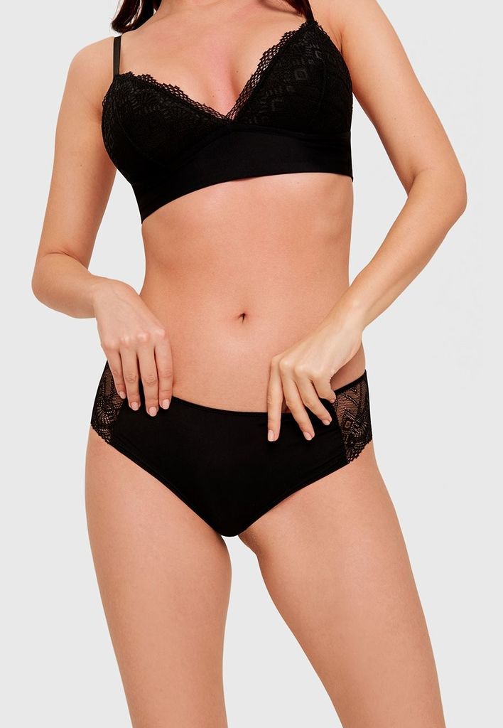 Комфортное бельё Sensera, которое умеет соблазнять. Трусики со средней посадкой выполнены из приятного телу эластичного материала и мягкого кружева с оригинальным геометрическим узором. Стильный мятны... Показать описанией цвет станет акцентом образа. Ажурный край делает белье незаметным под одеждой. Ластовица из хлопка.