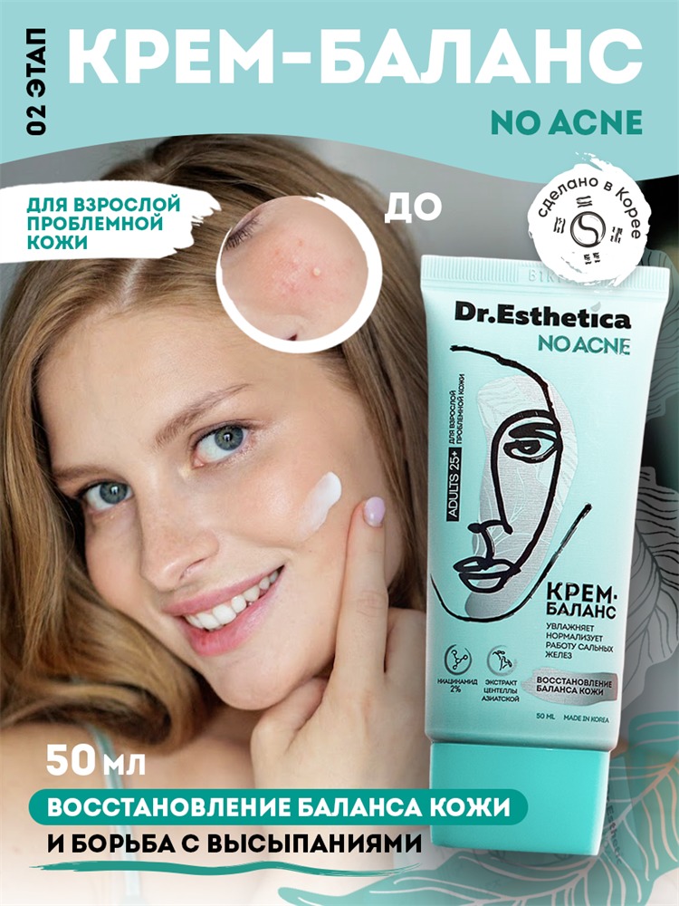 Проблемная кожа у взрослых имеет свои особенности и требует специального ухода. Взрослой коже необходим дополнительный уход для восстановления баланса, который легко нарушается под действием стресса и... Показать описание в результате физиологических изменений в организме. Себорегулирующий крем Dr. Esthetica NO ACNE - главное средство от прыщей на лице на этапе ухода. Проблемная кожа после 25 лет становится более чувствительной и уязвимой. Крем-баланс для проблемной кожи способствует регулированию выработки кожного сала и бережно увлажняет кожу, восстанавливает баланс, что особенно важно для предотвращения новых высыпаний. Крем для лица Dr. Esthetica разработан корейскими и российскими экспертами с учетом особенностей европейского типа кожи. Средство объединяет в своем составе природные компоненты и активные вещества, усиливающие действие друг друга и дающие мощный синергетический эффект. Специально подобранные компоненты нормализуют работу сальных желёз, эффективно увлажняют, препятствуя образованию акне, и восстанавливают баланс взрослой кожи, улучшая её состояние. Крем для проблемной кожи содержит активное вещество ниацинамид 2%, которое в сочетании экстрактом коры белой ивы регулирует выработку себума и тем самым защищает от образования прыщей на лице. Центелла азиатская в составе крема оказывает успокаивающее действие, снимает воспаление, покраснение и шелушение. Крем-баланс играет важную роль в процессе ухода за взрослой проблемной кожей и обеспечивает глубокое увлажнение. Увлажненная кожа реже склонна к высыпаниям, образованию прыщей и выработке излишнего себума. Средство от прыщей на лице Dr. Esthetica NO ACNE имеет доказанную эффективность: в результате тестирования 90% потребителей отметили, что крем не раздражает и увлажняет кожу; у 70% потребителей применение крема способствовало нормализации работы сальных желёз и уменьшению высыпаний. Крем от прыщей не содержит минеральных масел и красителей, прекрасно оздоравливает взрослую проблемную кожу, обеспечивая ей бережный уход.