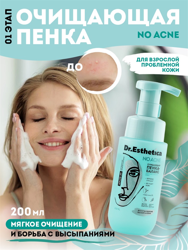 Проблемная кожа лица - частое явление, с которым сталкиваются не только подростки, но и взрослые. В среднем и зрелом возрасте кожа также может страдать от прыщей и черных точек. Хронический стресс, ... Показать описаниенесбалансированное питание, гормональные изменения, прием лекарств - основные причины появления акне у взрослых. Но после 25 лет проблемная кожа имеет ряд особенностей, которые важно учитывать при выборе очищающих средств. Кожа становится чувствительной, процесс заживления замедляется, увеличивается риск образования рубцов. Пенка для умывания лица Dr. Esthetica разработана для взрослых с проблемной кожей, склонной к появлению акне. Специально подобранный комплекс растительных экстрактов и активных веществ обеспечивает не только эффективное решение проблемы, но и сбалансированный уход, необходимый взрослой коже. Ниацинамид регулирует выработку кожного сала, снимает воспаление, активно увлажняет проблемную кожу. Экстракт центеллы азиатской успокаивает раздраженную кожу, оказывает противовоспалительное и регенерирующее действие. Экстракт коры белой ивы очищает кожу от омертвевших клеток, нормализует салоотделение, сужает поры, восстанавливает барьерные функции кожи и синтез коллагена. Эффективность средства для умывания лица подтверждена результатами потребительского тестирования: после применения пенки уровень салоотделения снизился на 86%. 73% потребителей отметили, что пенка не сушит кожу. Пенка для умывания для проблемной кожи не содержит парабенов и синтетических ароматизаторов. Состав бережно воздействует на взрослую чувствительную кожу, значительно улучшая её состояние и цвет лица. Пенка-баланс от прыщей и черных точек помогает подготовить кожу к следующему этапу - глубокому и бережному уходу. Пенка для умывания cleansing foam от акне - чистая кожа без сухости и раздражения.