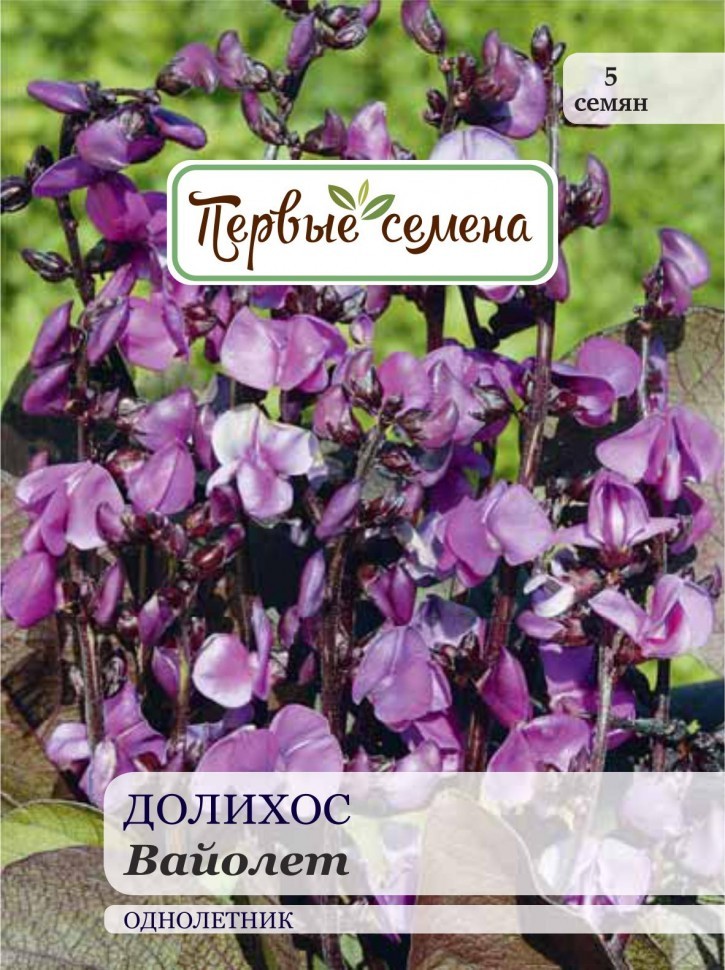 Удивительное, очень декоративное вьющееся растение! Цветки сиреневые, похожие на изящных мотыльков, красиво контрастируют с густыми плотными листьями разных оттенков – от темно-зеленого до насыщенного... Показать описание винно-красного. Через несколько недель после посадки начинают формироваться ярко-фиолетовые стручки с несколькими бобами внутри, пригодными для употребления в пищу. Сорт отличается высокой устойчивостью к холодному климату, болезням и вредителям. Перед посевом семена замачивают или скарифицируют (нарушают твердую семенную оболочку) и высевают на рассаду в отдельные горшочки. Долихос – растение теплолюбивое. Предпочитает хорошо прогреваемые солнечные участки с плодородной, некислой почвой. Необходима подвязка к опоре.
