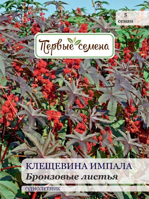 Быстрорастущий, очень декоративный многолетник, выращиваемый в средней полосе как однолетник. Куст высокий (до 150 см), с красными стеблями, производит крупные темно-зеленые пальмовидные листья, котор... Показать описаниеые приобретают пурпурный оттенок в течение сезона. Цветы собраны в пушистые ярко-алые соцветия, эффектно контрастирующие с темной листвой. Растение прекрасно вписывается в ландшафт, часто выращивается на больших участках, подходит для оформления заборов и изгородей. Предпочитает солнечные участки с хорошо дренированной плодородной почвой. Семена высевают в марте в горшочки или в апреле-мае непосредственно в грунт, по 1-2 семени на лунку. За сутки перед посевом семена следует замочить. Сеять клещевину рекомендуется на глубину от 6 до 1-2 см при температуре почвы не ниже 12 °С. Всходы появляются в течение 3-х недель. Семена клещевины ядовиты. Их нельзя употреблять внутрь. Работать с растением необходимо в перчатках, если имеются какие-либо повреждения кожного покрова на руках.