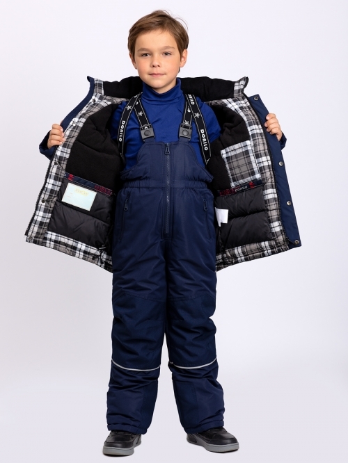 Сезон Холодная осень и зима. Температура от 5 до - 30 0 С в зависимости от поддеваемого нижнего белья. Описание Теплый комплект, состоящий из полукомбинезона и куртки, выполнен из плотной качественной... Показать описание ткани с водоотталкивающей пропиткой. Куртка: Зимняя куртка прямого силуэта с горизонтальной стежкой выполнена из принтованной ткани. Центральная застежка на молнию с верхней ветрозащитной планкой на кнопках. Воротник - стойка с мягким трикотажем с внутренней стороны. Отстегивающийся капюшон на кнопках со съемной меховой опушкой из натурального меха - енот на молнии. Концы капюшона застегиваются на липучки. По периметру капюшона эластичная регулируемая кулиска со стопперами. Прорезные карманы на молнии с фирменной фурнитурой. Втачные рукава с мягкими ветрозащитными трикотажными манжетами. Длину рукавов можно регулировать отворотом. По низу куртки эластичная регулируемая кулиска со стопперами. На спине шеврон с логотипом DNL. Светоотражательные канты на рукавах, капюшоне и молниях карманов. Благодаря утеплителю и флисовой подкладке до талии и в капюшоне, ваш мальчик не замерзнет холодной зимой. Полукомбинезон: Полукомбинезон с регулируемыми эластичными бретелями с логотипом Donilo. Флисовая подкладка до талии. Центральная застежка на молнии. Эластичная резинка по линии талии для лучшего прилегания по фигуре. Два кармана. Критичные места выполнены из более плотной ткани. Длина п/к регулируется отворотом, по низу штанин эластичные снегозащитные муфты. Важные детали: - защита подбородка. - внутренний карман на куртке. - нашивка - шеврон для данных ребенка (потеряшка). - светоотражательные элементы на куртке и брюках Производитель: TM Donilo Страна бренда: Россия Страна производитель: Китай