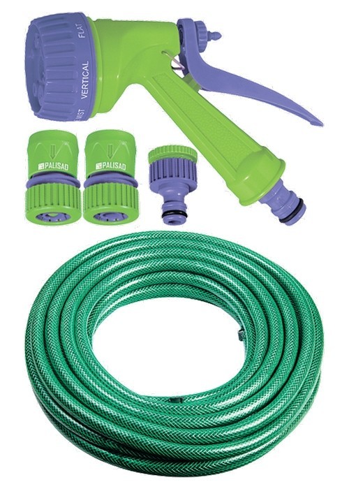 Поливочный набор Palisad 67423 состоит из шланга диаметром 3/4" и длиной 25 м, 7-режимного пистолета, соединителей и адаптера. Подключается к источнику водоснабжения через отвод или кран с внешней рез... Показать описаниеьбой диаметром 3/4" или 1/2". Трехслойный шланг с армирующим слоем отличается повышенной прочностью и выдерживает давление до 10 бар. Он хорошо держит форму, не скручивается и рассчитан на интенсивное использование. Набор полностью готов к работе и будет полезен для ухода за дачным участком, парком или сквером.ПреимуществаПрочность и долговечность — шланг изготовлен из высококачественного ПВХ, устойчивого к ультрафиолету, дополнительные элементы набора выполнены из ABS-пластика и не боятся коррозии.Выбор оптимального режима полива — пистолет-распылитель позволяет регулировать мощность и тип струи.Экологичность — все детали изготовлены из безвредных материалов, их использование безопасно для окружающей среды.Универсальность — коннекторы, адаптер и пистолет-распылитель совместимы с элементами всех поливочных систем ТМ Palisad.