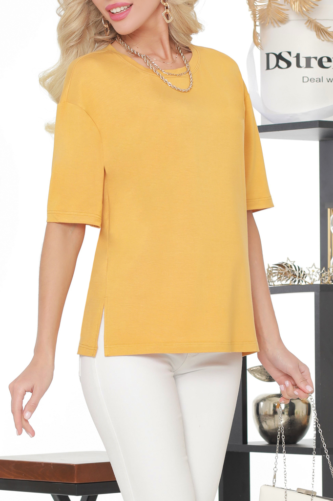 Базовая футболка свободного кроя — незаменимый элемент гардероба, благодаря которому можно составить стильные образы на все случаи жизни. Модель с коротким рукавом, округлым вырезом и небольшими разре... Показать описаниезами по бокам подходит женщинам любой комплекции, дарит чувство легкости и комфорта. Благодаря трикотажному материалу средней плотности носить футболку можно навыпуск, в заправленном виде, а также стильно завязать спереди на узелок, чтобы создать акцент на талии. Модель выполнена из качественной вискозной ткани, которая хорошо пропускает воздух, приятна к телу, не просвечивает и не выцветает. Чтобы лаконичная футболка долго сохраняла первоначальный вид, рекомендуется стирать ее в деликатном режиме при температуре до 30 градусов без отжима и сушить на плечиках. Обмеры изделия Длина: 44 размер - 58 см 46 размер - 58 см 48 размер - 59 см 50 размер - 59 см 52 размер - 60 см 54 размер - 60 см Уход Бережная стирка при 30 градусах Дополнение Цвет изделия на фотографии может отличаться от фактического товара, что связано с искажением цветопередачи монитором, настройками фотоаппаратуры и прочими факторами