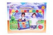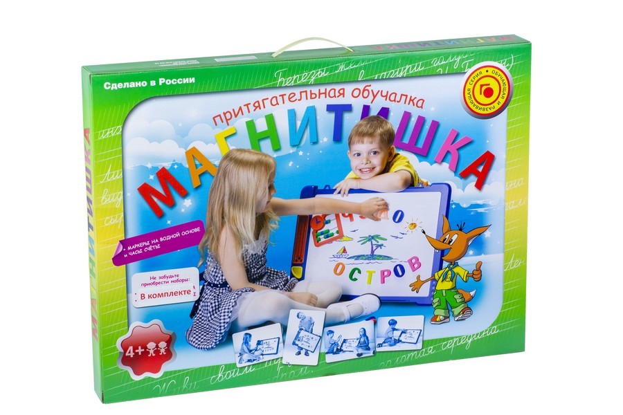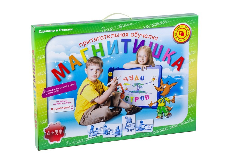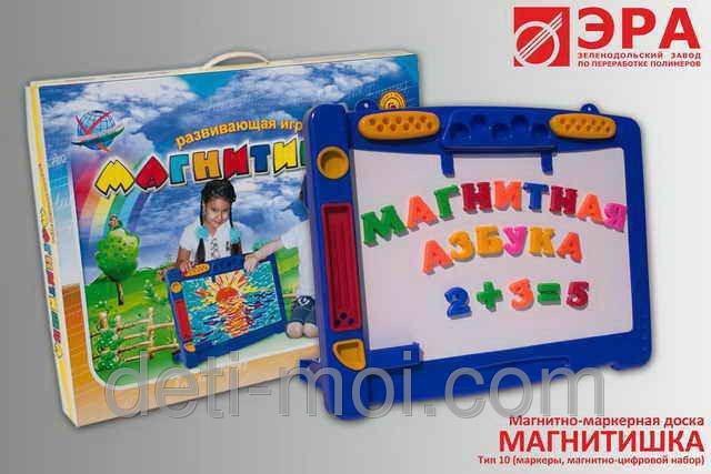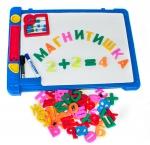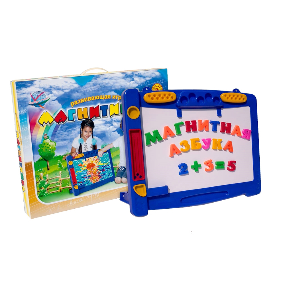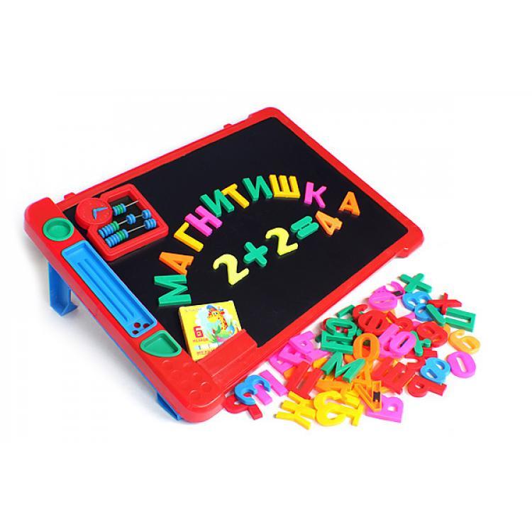 Доска «Магнитишка» с поверхностью белого цвета выглядит как в школе, а цвета играют на ней по-новому. Благодаря компактности ее всегда можно брать с собой. Привлекательная внешне — поверхность обрамле... Показать описаниена в яркий пластиковый корпус, который удобно держать в руках. В комплекте с доской — маркеры двух цветов, чтобы ребенок сразу попробовал ее в действии. Ребенок положит доску на подходящую поверхность или установит, как мольберт, представит себя художником. Теперь можно творить! Пусть он не сдерживает фантазии, а если что-то пойдет не так, губка спасет ситуацию и исправит неточности рисунка. Типы 5 и 6 дополнены счетами — пусть дети учатся считать без калькулятора. Типы 8 и 10 дополнены набором магнитных цифр и букв. На доске «Магнитишка» мальчики и девочки будут писать, рисовать и решать арифметические примеры. Если делать уроки стало скучно — предложите воспользоваться доской, и ребенку станет легче и интереснее. Доска пригодится и для игры в компании — пусть ребята сыграют в школьный урок или просто вместе порисуют. Состав игры: Доска в сборе – 1 шт., Кронштейны – 2 шт., Маркеры – 2 шт., Губка – 1 шт., Счеты-часы – 1шт., Набор магнитных цифр и букв – 1 шт., Упаковка – 1шт.