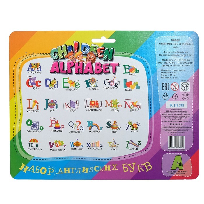 Комплектация: буквы английского алфавита. Материал: магнит, пластик. Упаковка: блистер на картоне с подвесом. Размер упаковки: 20*30*1 см. Размер букв: 3,5 см. Возраст: 5+ Набор магнитных букв предназ... Показать описаниеначена для детей от 5 лет как пособие для изучения английского языка. Буквы легко фиксируются на металлической доске-экране с помощью магнитов-вкладышей. Игра в увлекательной форме знакомит с алфавитом и математикой. В наборе пластиковые элементы ярких цветов, а также магнитные вкладыши к ним. Детали крепятся к любой металлической поверхности и привлекают внимание ребенка, позволяя тем самым непроизвольно развить визуальное восприятие и запомнить их очертания.