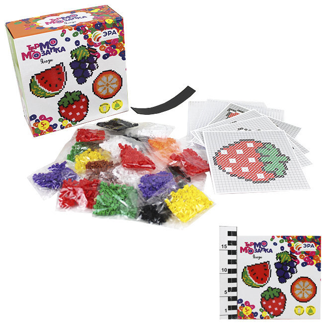 Термомозаика - оригинальный вид мозаики, картинка собирается на специальном поле, затем проглаживается утюгом, детали от нагревания скрепляются. Таким образом получается цельная картинка, которую можн... Показать описаниео снять с основы. В состав набора входят: 2 игровых поля для выкладывания мозаики (14х14 см), фишки, 20 пакетиков (8 цветов), цветная схема-пример 4 шт, пергамент для проглаживания 2 листа, магнитная лента. Игровое поле представляет собой пластиковую основу со штыречками. Фишки выполнены в виде маленьких полых цилиндриков. В процессе сбора картинки фишки надеваются на цилиндрики. Поле прозрачное, картинку-схему можно положить под него и собирать методом наложения. Предлагается собрать арбуз, дольку апельсина, виноград, клубнику. Конечно, можно не только пользоваться схемами, но и собирать свои собственные рисунки на любую тематику. Игра с такой мозаикой - очень хорошая тренировка для мелкой моторики. Фишки маленькие (5 мм) и, чтобы надевать их на штыречки, требуется не малая ловкость рук. Кроме того, сборка фигурок по образцу тренирует внимательность и усидчивость. Размеры: игровое поле 14,5х14,5 см - детали 0,5х0,4х0,4 см Упаковка: картонная коробка 18х18х7,5 см Рекомендованный возраст от 5 лет (до 8 лет под присмотром взрослых).