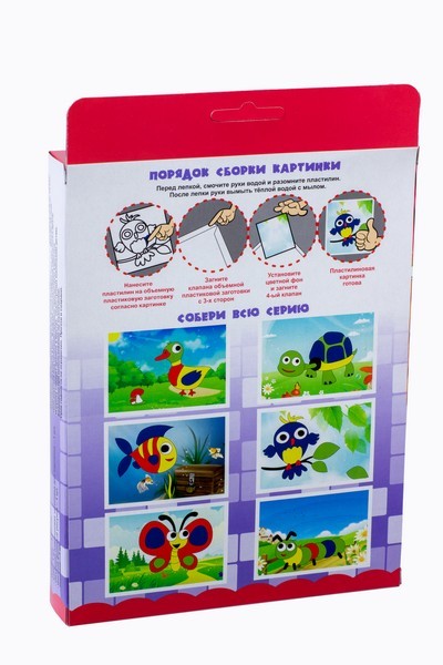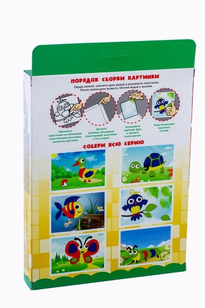 Набор «Пластилиновая картинка» – это набор для детского творчества, который позволяет создать яркий рисунок в необычной технике. Как сделать картину? Внимательно рассмотрите изображение на упаковке на... Показать описаниебора. Подготовьте доску для лепки. Отмерьте необходимое количество материала и сделайте заготовки для предстоящей картины. Мягкий эластичный пластилин создан специально для нежных пальчиков вашего крохи. Работа с ним легка и приятна. Перед началом лепки смочите руки водой. Слегка разомните пластилиновые заготовки и начинайте прикреплять их в углубления на пластиковой основе. Обратите внимание ребенка на очередность выполнения элементов рисунка. Сначала заполняются те участки картинки, которые мы видим на переднем плане. И только потом, вторым слоем, накладывается контрастный цвет. Рисунки на задней стороне коробки иллюстрируют особенность выполнения этой техники. Когда изображения будут готовы, наложите на них цветной фон с изображением и загните края пластиковой основы. Украсьте получившимся шедевром интерьер детской комнаты или подарите картину по случаю праздника. Создавайте прекрасный витраж своими руками с наборами «Пластилиновая картинка»! Что развивает набор? Работа с пластилином благотворно влияет на мелкую моторику и координацию движений рук ребенка. Необходимость отмерять нужное количество материала - развивает глазомер. Набор можно использовать для изучения цветов и знакомства с окружающим миром. Рисование пластилином успокаивает нервную систему и прививает трудолюбие. Создание объемной картины учит маленького мастера последовательно мыслить и действовать. Рисование пластилином – это увлекательный процесс, который развивает творческие способности вашего малыша. Состав игры: Пластилин – 6 цветов (белый, черный, синий, красный, желтый и зеленый) Стек – 1 шт., Объемная пластилиновая заготовка для картинки – 1 шт., Цветной фоновый рисунок – 1 шт., Упаковка – 1 шт.
