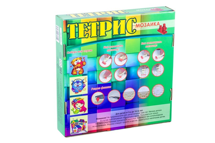 Детали серии игр «Тетрис-мозаика» похожи на фигурки из одноименной игры. Эта необычная игра позволит вашему ребенку создавать очень интересные картинки. Фишки маленькие, размером от 3,5 до 11 мм., поэ... Показать описаниетому в результате получаются очень качественные, детализированные изображения. Фишки пластиковые, самая маленькая представляет собой квадратик 3,5х3,5 мм, сама большая – прямоугольник 11х3,5 мм. Еще есть квадраты 7х7 мм, уголки 7х7 мм, и прямоугольники 7х3,5 мм. Фишки в мозаике скреплены блоками, перед началом игры их нужно разъединить. Как складывать картинки из тетрис-мозаики? Мозаика собирается на одном из игровых полей. Варианты картинок представлены на упаковке или вкладыше. Мозаика собирается по принципу тетриса – свободных мест на картинке остаться не должно. Для более плотного закрепления деталей на доске, и для того, чтобы их оттуда вытащить, используется съемник. Что развивает эта игра? Мозаика развивает художественный вкус ребенка, позволяет ему проявить творческую активность и служит особым средством познания мира. Кроме того, она прекрасно развивает мелкую моторику, согласованность движений, развивает способности к моделированию, усидчивость, наблюдательность, пространственное и абстрактное мышление, учит работать по предложенным схемам и сочинять свои собственные сюжеты.