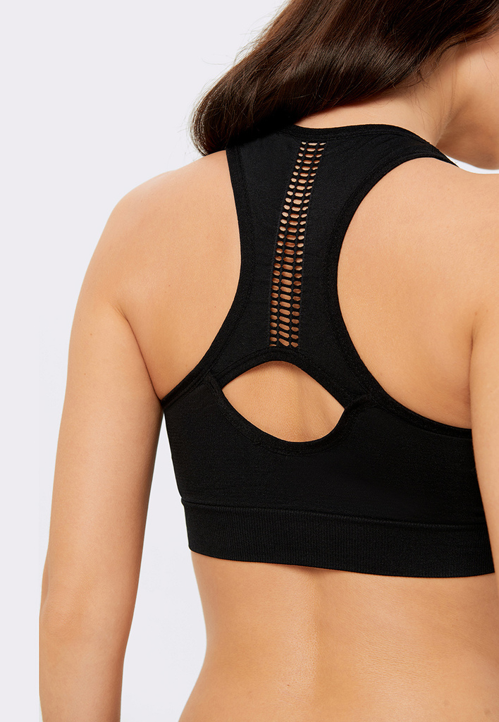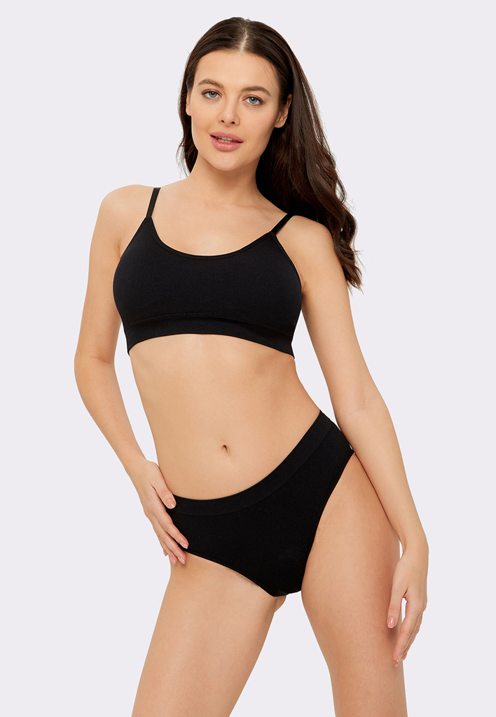 Идеальное черное базовое бесшовное бельё на каждый день и для занятий спортом. Бюстгальтер-топ с тонкими регулируемыми бретелями и лентой под грудью, что обеспечивает оптимальную посадку. Выполнен из ... Показать описаниетрендового и практичного материала в рубчик (резинка риб). Мягкие чашки без косточек дополнены съемными формованными вкладышами. Это позволяет не только менять образ по вашему усмотрению, но и значительно продлить срок службы белья при стирке. Если чашки деформировались при транспортировке, их форму легко вернуть с помощью отпаривателя. Отсутствие застежки — еще один плюс в копилку комфорта. Осторожно, белье настолько комфортное, что вы можете забыть, что надели его!