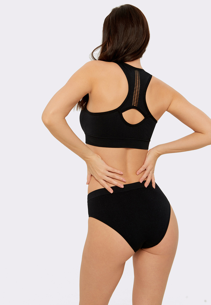 Уют домашнего тихого дня… Ощущайте его всегда с базовым комплектом белья Sensera в глубоком черном цвте. Бюстгальтер выполнен из двойного нежного материала. Натуральный хлопок делает материал дышащим ... Показать описаниеи приятным телу, добавление полиэстера позволяет белью оптимально сидеть на теле. Мягкие чашки без косточек и широкие регулируемые бретели заботятся о вашем комфорте. Эластичная лента под грудью, боковые корсетные вставки и застежка на 2 крючка обеспечивают идеальную посадку. Глубокий V-образный вырез сохранит чувство женственности и элегантности. Бюстгальтер подойдет на каждый день, для занятий спортом, йогой и любыми любимыми делами.