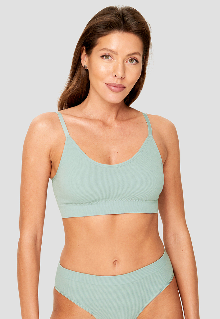 Идеальное базовое белье на каждый день и для занятий спортом. Бюстгальтер выполнен из трендового материала в рубчик (резинка риб) в актуальном зеленом оттенке. Мягкая чашка без косточек дополнена съем... Показать описаниеными формованными вкладышами. Это позволяет значительно продлить срок службы белья при стирке. Эластичная подкладка невероятно приятна телу и сохраняет комфорт. Мягкие эластичные края не оставляют следов на коже. Тонкие регулируемые бретели, лента под грудью и эластичность материала обеспечивают оптимальную посадку и поддержку. Отсутствие застежки — еще один плюс в копилку комфорта. Осторожно, белье настолько комфортное, что вы можете забыть, что надели его!