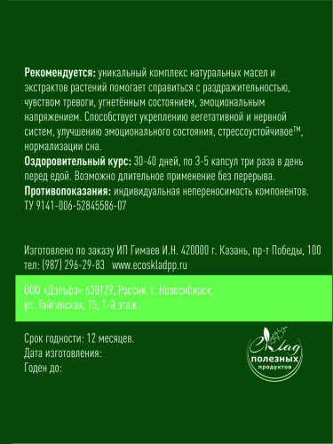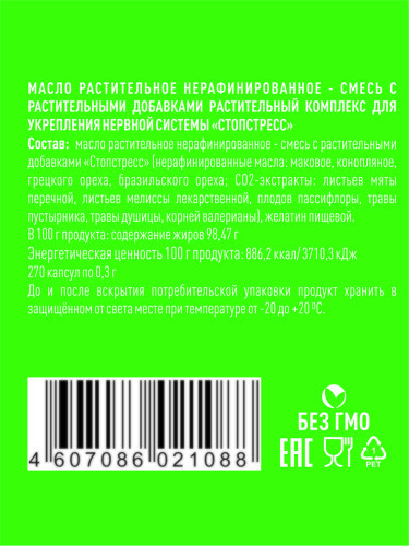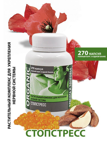 При изготовлении этого уникального продукта были использованы сберегающие крио-технологи, позволяющие получить СО2-экстракты в максимально полезной концентрации для организма. Тщательно рассчитанные э... Показать описаниекспертами в области медицины пропорции компонентов в составе продукта раскрывают свойства друг друга, взаимно усиливая действие. По всей стране уже успели оценить тысячи покупателей эффект от приема этих капсул, заметив положительные изменения в повышении стрессоустойчивости. Сочетание в продукте натуральных масел маковое, грецкого ореха, бразильского ореха, а также СО2-экстракты: листьев мяты перечной, листьев мелиссы лекарственной, плодов пассифлоры, травы пустырника, травы душицы, корня валерианы. Служит источником ОМЕГА-3 полиненасыщенных жирных кислот, натуральных жирорастворимых витаминов – А, В, С, Е, D. Продукт упакован в удобную банку, защищающую капсулы от солнечного света и повышающую срок годности, которую также легко взять с собой куда бы вы не отправились. Крышка банки защищена специальным кольцом от вскрытия. Информативная упаковка еще на этапе выбора капсул подробно рассказывает о свойствах продукта, раскрывая необходимую информацию покупателю. Капсула имеет круглую форму, масляная композиция в ней имеет прозрачное содержимое. Оболочка из желатина защищает растительные масла от окисления, делает прием продукта более удобным и приятным. Капсула имеет оптимальный небольшой размер, удобный для проглатывания. Возможен альтернативный способ употребления капсул помимо запивания водой: раздавить капсулу в ложке и выпить содержимое на голодный желудок; рассосать капсулу до растворения желатиновой оболочки; добавить капсулу в кашу, где ее оболочка раствориться. Применение: оздоровительный курс: 30 дней, по 3 капсулы три раза в день перед едой. Возможно длительное применение без перерыва. В каждой упаковке находится по 270 капсул, таким образом на курс в 30 дней по 3 капсулы 3 раза день, потребуется 1 баночка. Отпускается без рецепта. Капсулы рекомендуется хранить в темном защищенном от солнечного света месте, допускается хранение в холодильнике. Станьте устойчивыми к стрессу! Состав: нерафинированные масла: маковое, конопляное, грецкого ореха, бразильского ореха, СО2-экстракты: листьев мяты перечной, листьев мелиссы лекарственной, плодов пассифлоры, травы пустырника, травы душицы, корней валерианы, желатин пищевой.