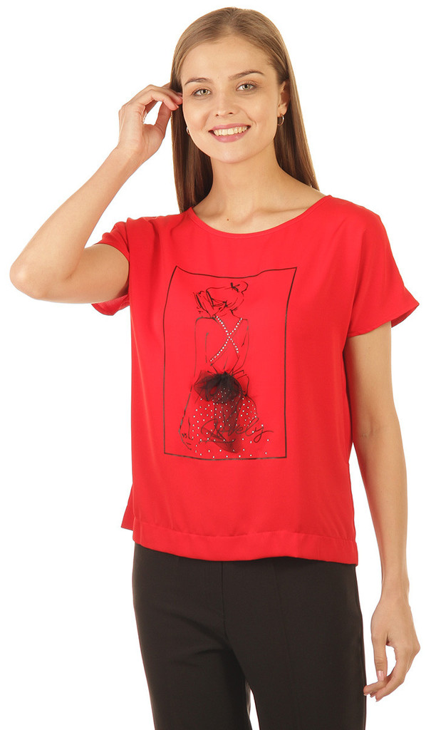 Состав: 100% полиэстер. Сезон: Весна-Лето. Производитель: Киргизия. Фактура материала: Текстильная. Тип рукава: Короткий. Декоративные элементы: Стразы, фатиновый бант. Вид горловины: Круглый. Покрой:... Показать описание Прямой. Рисунок: Принт. Вид застёжки: Без застёжки. Цвет: Красный. Размер: 44