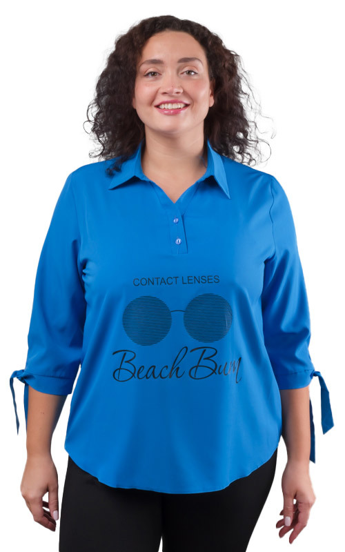 Состав: 100% полиэстер. Сезон: Круглогодично. Производитель: Киргизия. Тип карманов: Без карманов. Тип рукава: 3/4. Вид горловины: Рубашечный. Покрой: Прямой. Рисунок: Принт, надписи. Вид застёжки: Пу... Показать описаниеговица. Цвет: Синий. Размер: 52 Стильная блузка прямого силуэта. Рукав 3/4 на манжете с завязками. Низ блузки закруглённый.