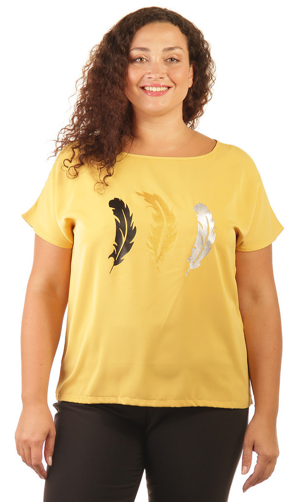Состав: 100% полиэстер. Сезон: Весна-Лето. Производитель: Киргизия. Фактура материала: Текстильня. Тип рукава: Короткий. Вид горловины: Лодочкой. Покрой: Прямой. Рисунок: Принт перья. Вид застёжки: Бе... Показать описаниез застёжки. Цвет: Горчичный. Размер: 48