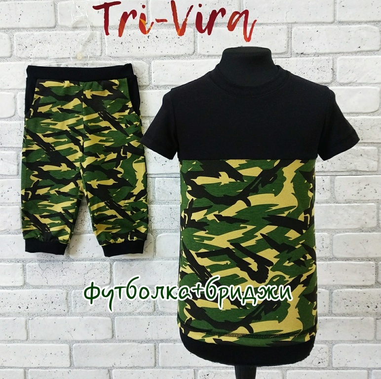 Комплект: футболка+бриджи, изготовлен из 100% хлопка. Мягкая трикотажная ткань, классический крой и точное соответствие размеру, все эти достоинства отлично послужат активному любителю приключений. Мо... Показать описаниедель универсальна, подойдет для детей любого возраста. Материл: кулирка (100% хлопок) Цвета в ассортименте: Арт: 2КУЛ/1/1А Хаки камуфляж+черный Арт: 2КУЛ/1/1 Хаки камуфляж+желтый