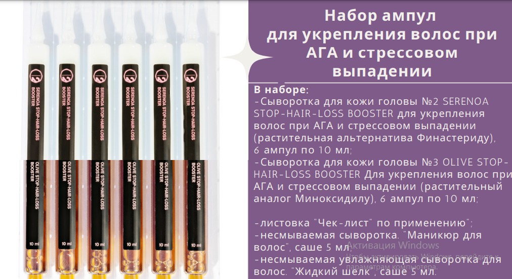Цена без акции - 745 рублей. Сыворотка для кожи головы №2 SERENOA STOP-HAIR-LOSS BOOSTER для укрепления волос при АГА и стрессовом выпадении (растительная альтернатива Финастериду) Действующее веществ... Показать описаниео: Стандартизованный липостероидный экстракт пальмы сереноа – 3%. 1. Эффективно и безопасно снижает в коже головы уровень содержания DHT, реализуя механизмы №2 и №3 - экстракт пальмы сереноа в два раза (примерно на 50%) блокирует захват дигидротестостерона рецепторами андрогенов. 2. Блокирует все основные факторы, повреждающие корень волоса - уменьшает гибель клеток волосяного фолликула и замедляет разрушение белка волос. 3. Снижает преждевременный переход корней волос в фазу сна и увеличивает количество волос в фазе активного роста. Сыворотка для кожи головы №3 OLIVE STOP-HAIR-LOSS BOOSTER Для укрепления волос при АГА и стрессовом выпадении (растительный аналог Миноксидилу) Действующее вещество: Экстракт листа оливы, сконцентрированный по олеуропеину (30% олеуропеина) – 3%. 1. Эффективно и безопасно снижает в коже головы уровень DHT путем реализации механизма №1 – олеаноловая кислота из оливы в два раза (на 54%) снижает превращение тестостерона в активную форму. 2. Активирует процесс размножения и роста клеточек волосяного фолликула за счет стимуляции выработки нужных факторов роста. 3. Способствует ускорению перехода волос в фазу активного роста и увеличению его длительности, что обеспечивает прирост объема и длины волос. Для получения максимального эффекта рекомендуется использовать Сыворотки для кожи головы № 2 и № 3 в комплексе с Сывороткой для кожи головы № 1 Energy Booster от Nano Organic, специально разработанной для улучшения кровообращения в коже головы. ВАЖНО! Продукты не имеют синдрома отмены! Составы средств умеренно утяжеляют волосы, поэтому допустим вариант применения средств на ночь. Утром достаточно однократно помыть волосы мягким шампунем и нанести на длину привычный бальзам. В этом случае эффект снижается на 30 – 35% (для полного эффекта нужно наносить продукт на чистую кожу головы, сразу после мытья). ВНИМАНИЕ: возможна индивидуальная непереносимость компонентов продукта. Если более 2-х часов после нанесения сохраняется зуд или появилось шелушение, то необходимо временно перейти на поддерживающий режим применения. Если реакция не исчезла, то применение прекратить. В процессе хранения возможно выпадение осадка. Это нормальный процесс и не влияет на качество и эффективность продукта. Перед употреблением встряхнуть ампулу. Удобный график применения, информацию для специалистов и ссылки на исследования смотрите на листовке внутри коробки. Способ применения равномерно нанести на кожу головы сыворотку Energy Booster, разделяя волосы по проборам, подождать 5 минут. Таким же образом нанести содержимое соответствующей ампулы. Не смывать, дать высохнуть, уложить волосы, как обычно. Режим интенсивного ухода (оптимальная длительность – 1 месяц). Использовать ежедневно, чередуя Сыворотку № 2 и Сыворотку № 3. Поддерживающий режим. Использовать Сыворотку № 2 и Сыворотку № 3, чередуя их через 1 или 2 дня ( получится 2-3 процедуры в неделю). Состав Состав Сыворотка для кожи головы №2 SERENOA STOP-HAIR-LOSS BOOSTER: Вода очищенная (Aqua) пропиленгликоль (Propylene Glycol) липостероидный стандартизованный экстракт пальмы сабаля 3% (Serenoa Serrulata (Sawpalmetto) Fruit Extract 3%) солюбилизатор из кокос