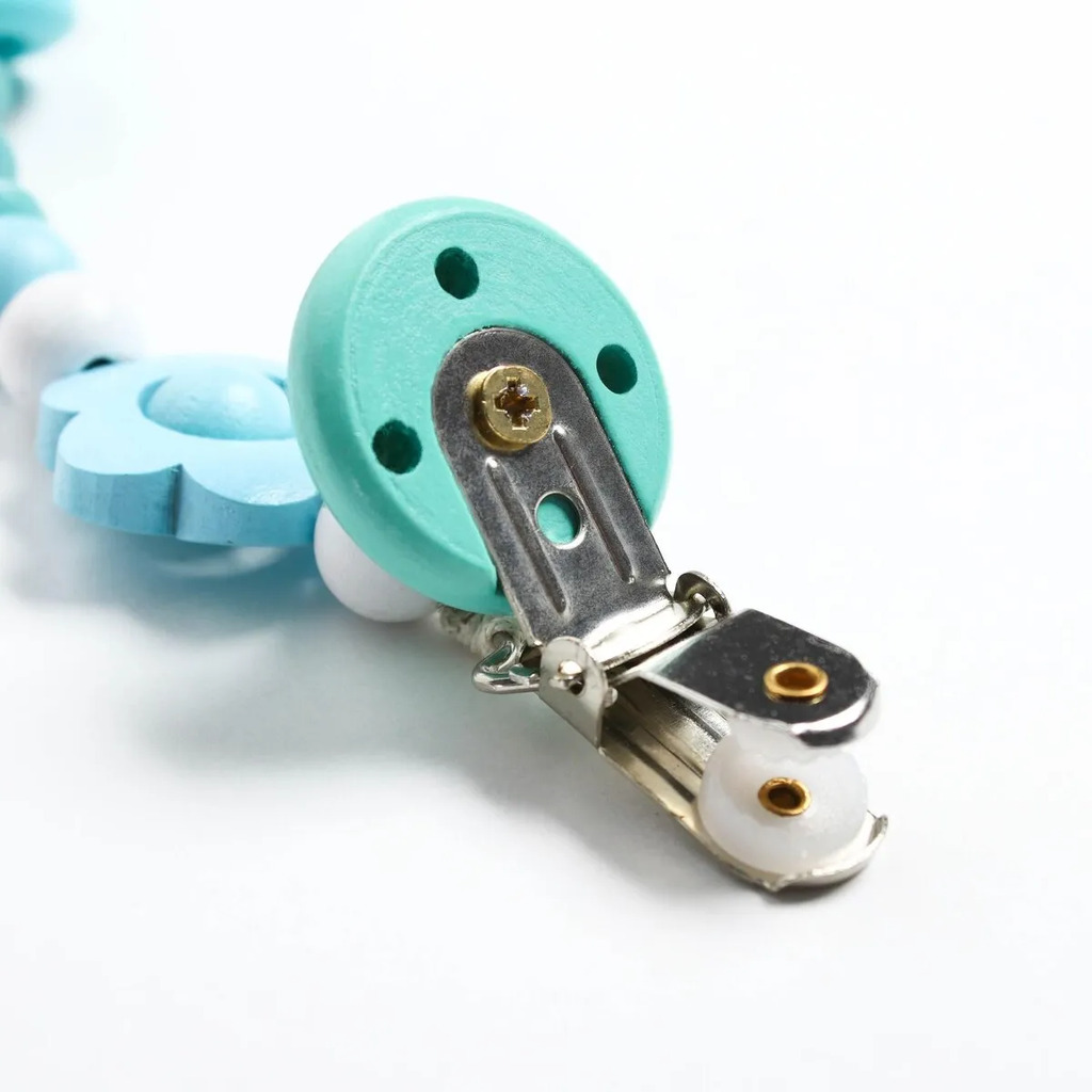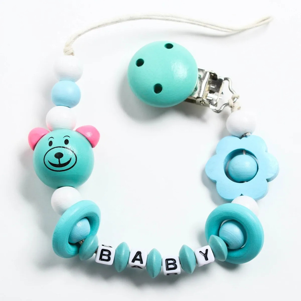 Больше информации (есть отзывы). Держатель для соски - пустышки Мишка», дерев, цвет бирюзовый. Прищепка для пустышки предотвратит потерю маленького предмета. Используйте специальный держатель, и соска всегда будет под рукой! Изделие фиксируется на одежде ребенка. На конце цепочки есть карабин, который зацепляется за кольцо пустышки. Надежное крепление убережет вещь от падения на пол, если малютка случайно выронит ее изо рта. С держателем можно играть, притягательный дизайн точно понравится малышу. Товар изготовлен из качественного нетоксичного материала. Подходит для деток с рождения.