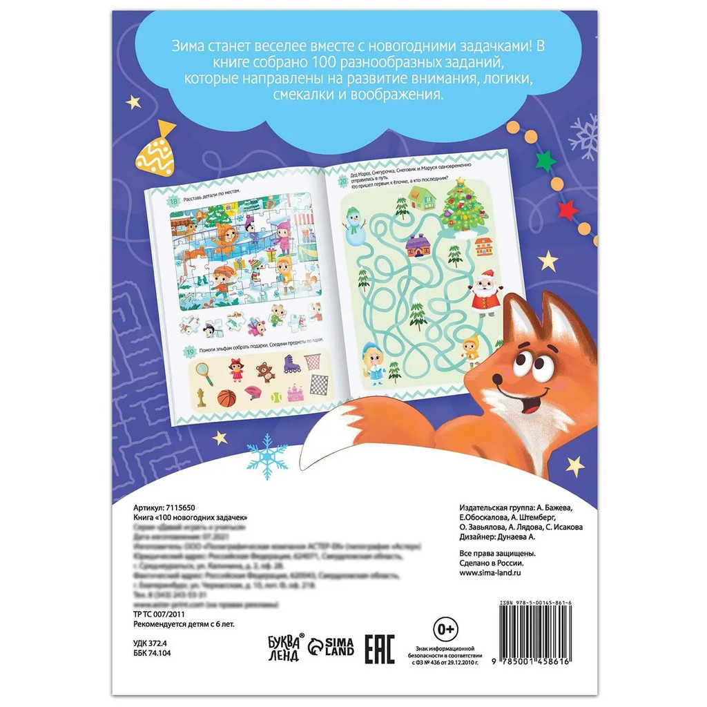 Больше информации (есть отзывы). Книга 100 новогодних задачек», 48 стр, 7+. Зима станет веселее вместе с новогодними задачками! В книге собрано 100 разнообразных заданий, которые направлены на развитие внимания, логики, смекалки и воображения. В книге малыш найдет: задачки; ребусы; кроссворды; раскраски. Рекомендовано для детей от 6 лет.