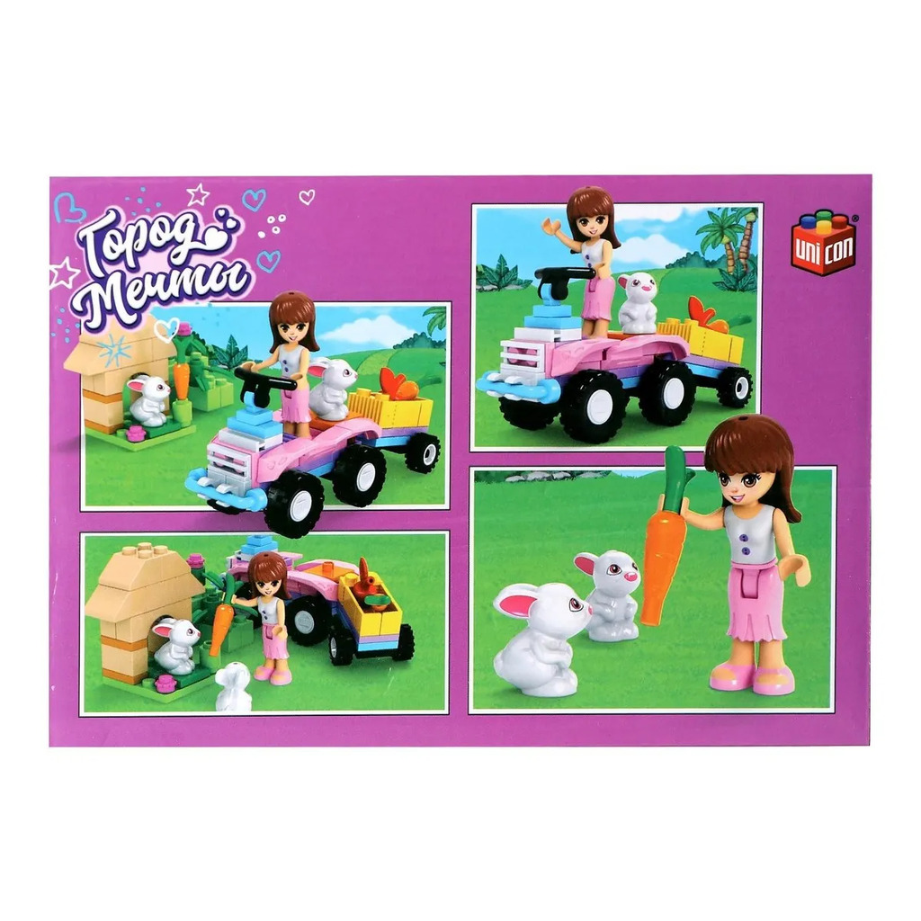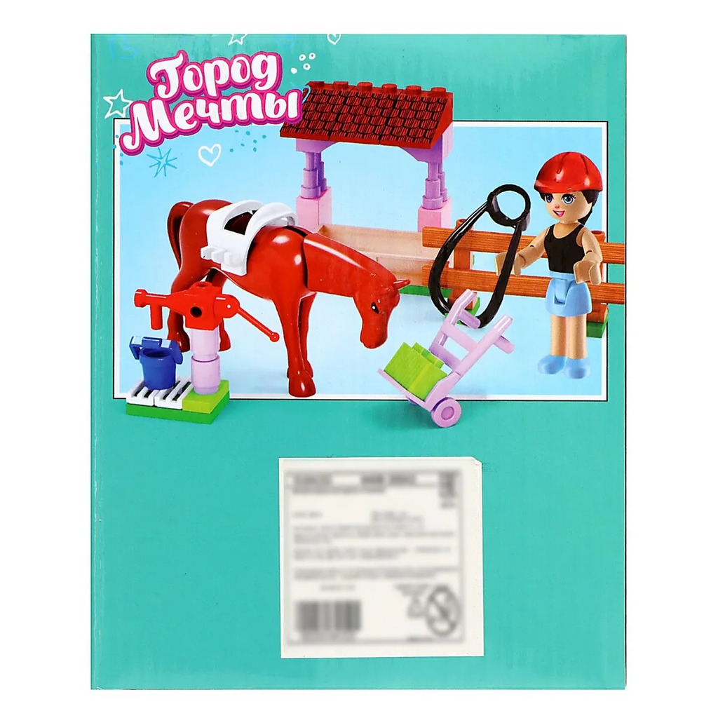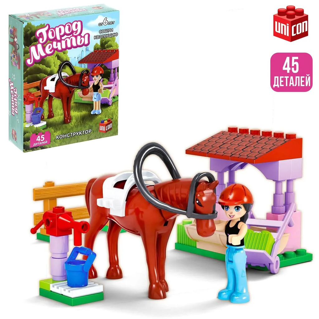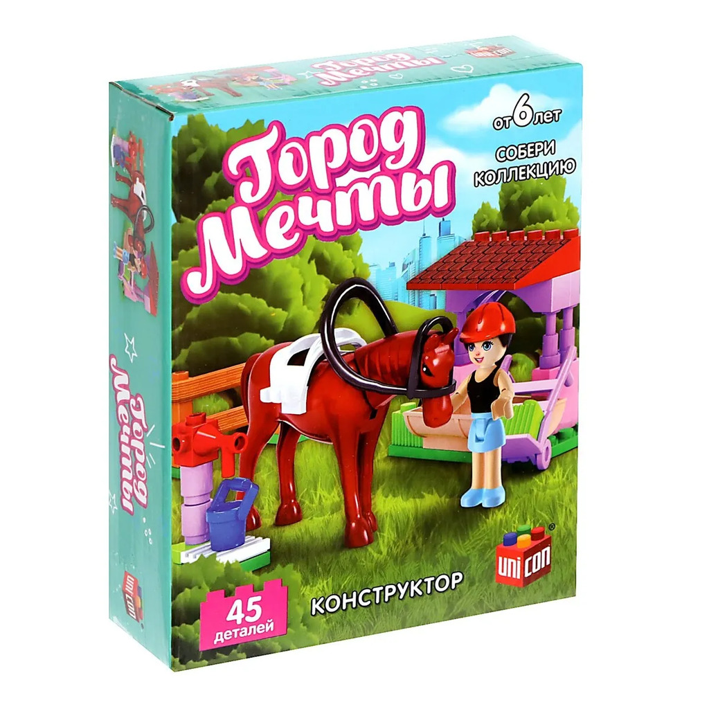 Больше информации (есть отзывы). Конструктор Город Мечты Конюшня», 45 деталей. Мечта каждой девочки! Конструктор UNICON Город мечты, это место где мечтает побывать каждая девочка. Соберите все игровые сюжеты розвого мира! Особенности: Элементы изготовлены из высококачественной пластмассы, надежно соединяются между собой и разбираются без особого труда. Не только увлекательно, но и полезно! Следуйте подробной инструкции, и ребенок с легкостью соберет сюжет. Конструируя, ребенок развивает мелкую моторику рук, познавательную активность и воображение, становиться усидчивее и внимательнее. Товар предназначен для детей старше 6 лет.