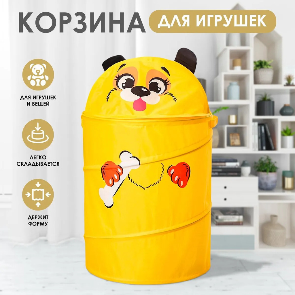 Больше информации (есть отзывы). Корзина для игрушек Собачка с косточкой» с ручками и крышкой. Данная корзина предназначена для хранения игрушек и других важных вещей малыша. Она поможет поддерживать чистоту в доме и приучить ребенка к порядку. Отсутствие острых углов, прочные и легкие материалы делают предмет незаменимым в детской комнате. Такая корзина пригодится в поездках: в ней будет удобно собрать любимые игрушки, с которыми чадо не может расстаться ни на минуту. Она компактна, но вместит все необходимое, и вещи не рассыплются в дороге. Если изделие стало ненужно, его можно сложить, так оно займет совсем немного места. Размер корзины с учетом крышки: высота 60 см; ширина 33 см; длина 33 см.