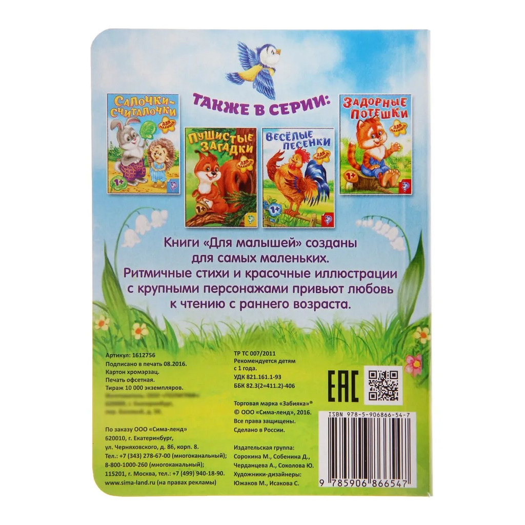 Больше информации (есть отзывы). Книга картонная Прибаутки для малютки», 10 стр. Книжки серии Для малышей» это первые помощники ребенка в изучении окружающего мира. Они сделаны из картона, поэтому будут долго служить подрастающим детям. В книге собраны веселые прибаутки рифмованные двустишия расскажут малышу о лесных животных. Ребенок сможет сам или при помощи родителей находить соответствия слов и картинок, запоминая тем самым названия зверят.