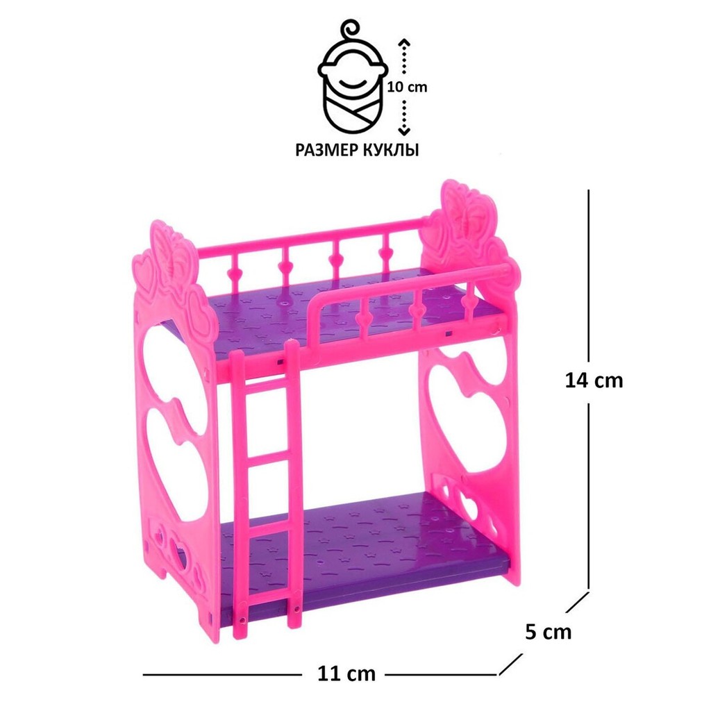 Больше информации (есть отзывы). Аксессуары для кукол: кроватка двухъярусная Малышка». Каждая девочка заботится о своей кукле как о настоящем малыше. Поэтому очень важно помочь ребенку создать максимально интересное и удобное игровое пространство. На двухъярусную кроватку можно положить двух кукол одновременно. Игрушка легко собирается. Размер кроватки: 11. 5 ? 5 ? 14 см. Подходит для кукол 8 10 см.