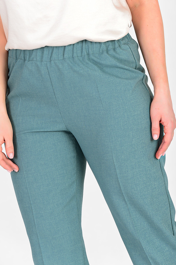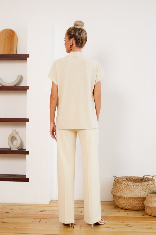 Комплект из брюк и джемпера. Брюки прямого силуэта из эластичного полотна. Пояс притачной с эластичной резиной. На передней части брюк застрочены стрелки. Джемпер свободного силуэта из фактурного элас... Показать описаниетичного полотна. Цельнокроеный короткий рукав. По центру передней части изделия выполнен шов. Цельнокроеная стойка, переходящая в V-образный вырез горловины, визуально делает фигуру стройнее. Больше картинок и информации (есть отзывы) на странице.