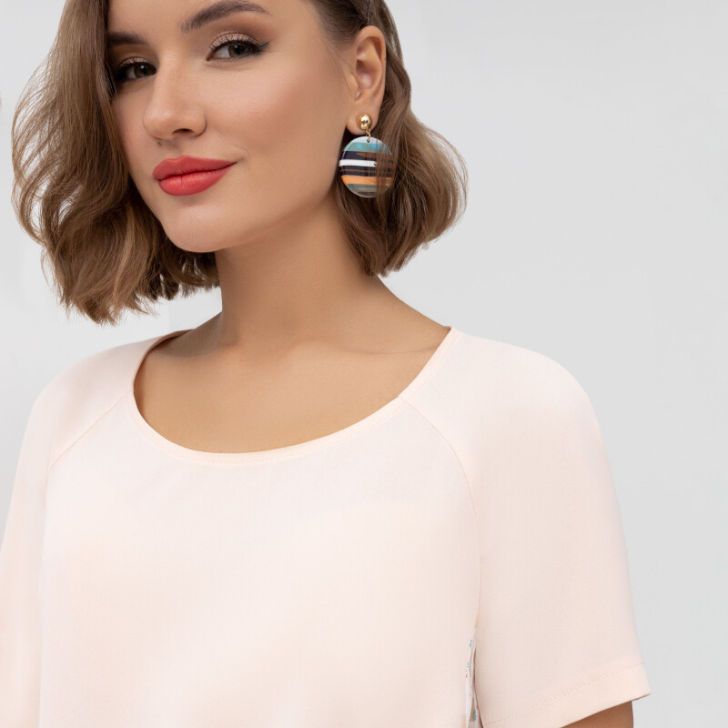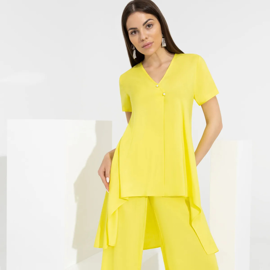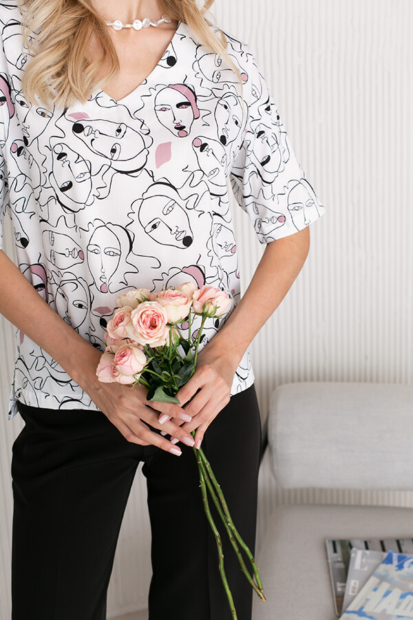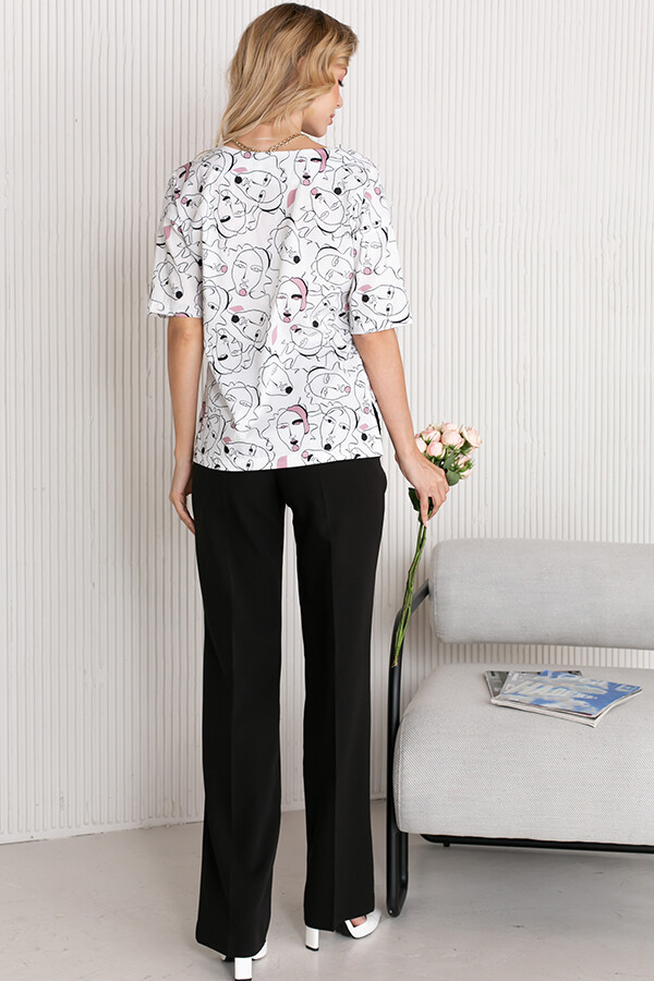 Больше информации (есть отзывы). Комплект из блузы и брюк. Блуза свободного силуэта из сорочечной ткани с принтом. Низ изделия асимметричной длины (спинка удлинена относительно переда) с разрезами в боковых швах. Втачной рукав в спущенную пройму. V-образный вырез горловины. Брюки прямого силуэта. Пояс притачной с эластичной резиной. На передней части брюк застрочены стрелки.