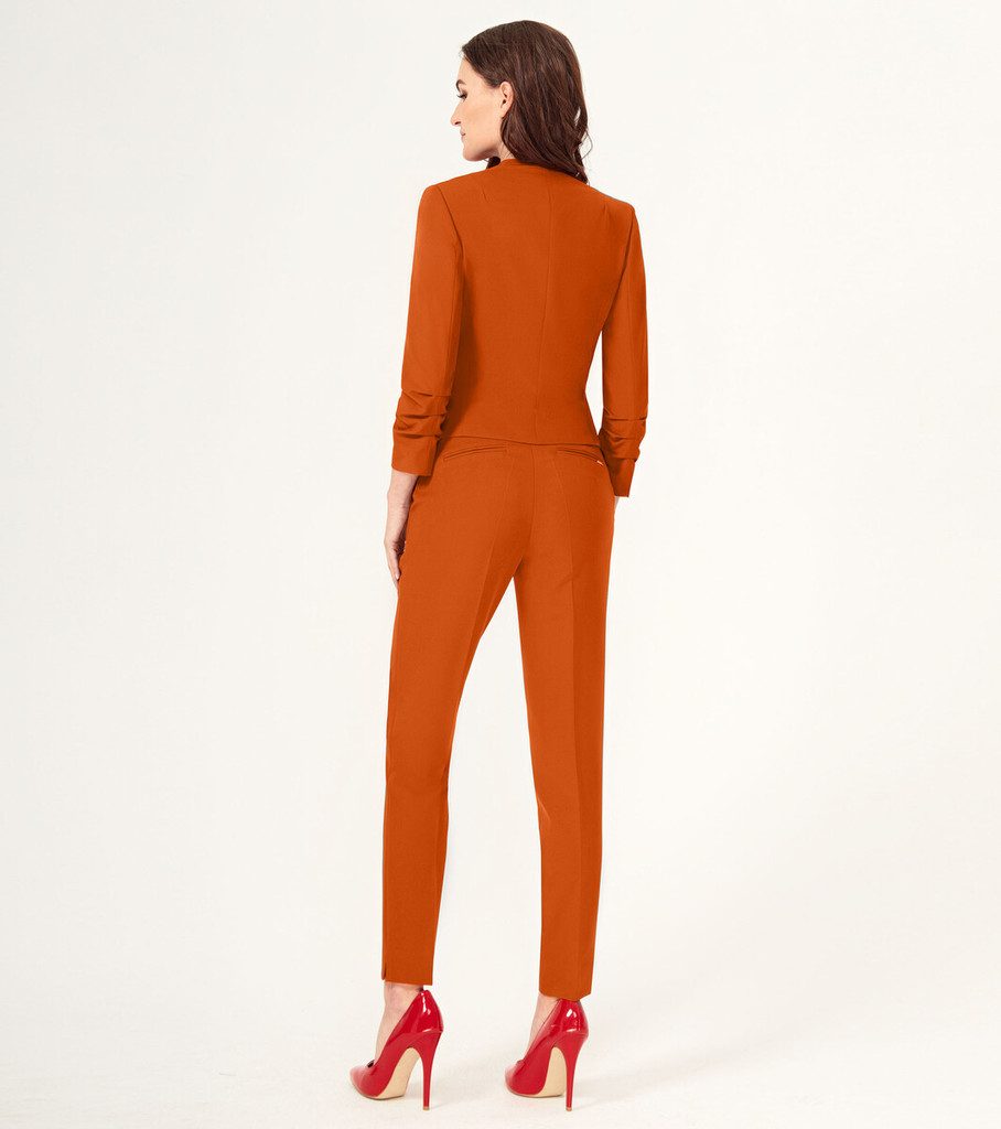 Больше информации (есть отзывы). Стильный лаконичный брючный костюм. Жакет с застежкой на одну пуговицу. Жакет полуприлегающего силуэта, с V-образным вырезом горловины. По переду и по спинки имеются вытачки и рельефы, которые обеспечивают отличную посадку изделия по фигуре. Рукава втачные, длиной 3/4. Брюки классические на поясе, укороченые, с карманами по переду. Отличный вариант как для деловых встреч, так и для торжественных мероприятий. Параметры изделия: Размер 42 Жакет: Длина рукава - 53 см, Длина спинки - 49 см, Ширина плеча - 10,8 см, Ширина по груди - 45 см, Ширина по низу - 43 см, Ширина рукава - 15,9см; Брюки: Высота посадки - 23 см, Длина брюк без пояса - 93,5 см, Длина по внутреннему шву - 73,5 см, Ширина брючин сверху - 58 см, Обхват брюк по низу - 30 см, Ширина по бедрам - 46 см, Ширина по талии - 34,5см; Размер 44 Жакет: Длина рукава - 53 см, Длина спинки - 49 см, Ширина плеча - 11 см, Ширина по груди - 47 см, Ширина по низу - 45 см, Ширина рукава - 16,5см; Брюки: Высота посадки - 23,5 см, Длина брюк без пояса - 93,5 см, Длина по внутреннему шву - 73,5 см, Ширина брючин сверху - 60 см, Обхват брюк по низу - 30 см, Ширина по бедрам - 48 см, Ширина по талии - 36,5см; Размер 46 Жакет: Длина рукава - 53 см, Длина спинки - 49 см, Ширина плеча - 11,2 см, Ширина по груди - 49 см, Ширина по низу - 47 см, Ширина рукава - 17,1см; Брюки: Высота посадки - 24 см, Длина брюк без пояса - 93,5 см, Длина по внутреннему шву - 73,5 см, Ширина брючин сверху - 62 см, Обхват брюк по низу - 30,5 см, Ширина по бедрам - 50 см, Ширина по талии - 38,5см; Размер 48 Жакет: Длина рукава - 53 см, Длина спинки - 50 см, Ширина плеча - 11,4 см, Ширина по груди - 51 см, Ширина по низу - 49 см, Ширина рукава - 17,7см; Брюки: Высота посадки - 24,5 см, Длина брюк без пояса - 93,5 см, Длина по внутреннему шву - 73,5 см, Ширина брючин сверху - 64 см, Обхват брюк по низу - 31 см, Ширина по б
