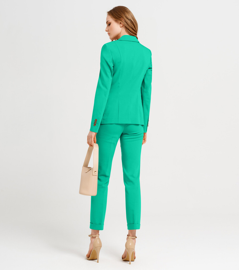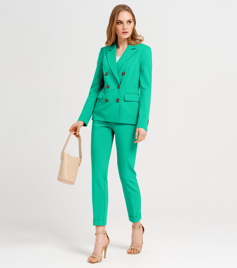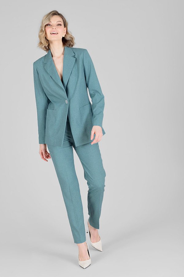 Больше информации (есть отзывы). Подчеркните свою элегантность и в то же время строгость, надев женский костюм классический. Приятная расцветка разбавит скучный офисный гардероб яркими красками. Деловой женский костюм можно носить каждый день на работу и различные официальные встречи. Классический женский костюм с лаконичным дизайном можно сочетать с блузками и рубашками. Укороченный однобортный пиджак без воротника дополнен присборенными рукавами3/4 и прорезными карманами в рамке на полочках. Пиджак приталенного силуэта образует V-образный вырез, когда застегнут на одну пуговицу. Прямые брюки с идеально отутюженными стрелками украшают наклонные карманы и широкий пояс. Брючный женский костюм подойдет для повседневной носки в теплое время года. Пиджак и брюки можно носить по отдельности, создавая стильные образы с другой одеждой. Женский костюм с брюками представлен в разнообразных расцветках: от строгого черного цвета до сочных оттенков. Вы можете купить офисный женский костюм, выбрав подходящий размер и цвет. Параметры изделия: Размер 42 Жакет: Длина рукава - 53 см, Длина спинки - 49 см, Ширина плеча - 10,8 см, Ширина по груди - 45 см, Ширина по низу - 43 см, Ширина рукава - 15,9см; Брюки: Высота посадки - 23 см, Длина брюк без пояса - 93,5 см, Длина по внутреннему шву - 73,5 см, Ширина брючин сверху - 58 см, Обхват брюк по низу - 30 см, Ширина по бедрам - 46 см, Ширина по талии - 34,5см; Размер 44 Жакет: Длина рукава - 53 см, Длина спинки - 49 см, Ширина плеча - 11 см, Ширина по груди - 47 см, Ширина по низу - 45 см, Ширина рукава - 16,5см; Брюки: Высота посадки - 23,5 см, Длина брюк без пояса - 93,5 см, Длина по внутреннему шву - 73,5 см, Ширина брючин сверху - 60 см, Обхват брюк по низу - 30 см, Ширина по бедрам - 48 см, Ширина по талии - 36,5см; Размер 46 Жакет: Длина рукава - 53 см, Длина спинки - 49 см, Ширина плеча - 11,2 см, Ширина по груди - 49 см, Ширина п