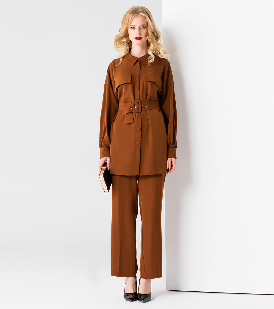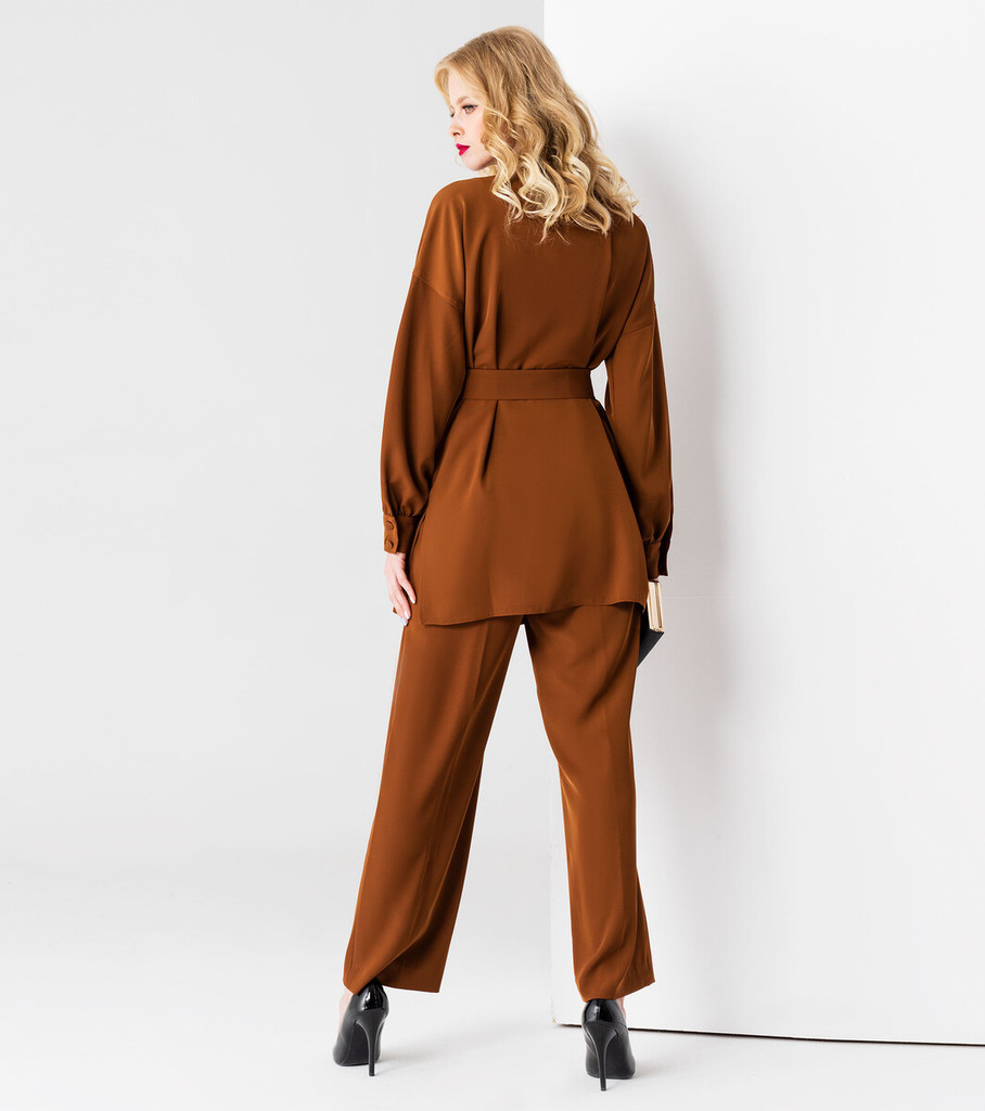 Больше информации (есть отзывы). Стильный брючный комплект из струящийся ткани. Блузка- рубашка трендовая вещь этого сезона, прямого силуэта, с воротником, с нагрудными карманами и широкими объемными клапанами, с центральной застежкой на петли пуговицы, удлиненная, в боковых швах разрезы, при желании подчеркнуть фигуру, прилагается пояс из основной ткани. Спинка лаконичная. Создать стильный, элегантный, свободный образ помогут эффектные свободные, брюки на поясе, широкие, длинные, в боковых швах карманы, от пояса складки. Вы уже- идеал для подражания, костюм говорит сам за себя. Разнообразить лук помогут яркие аксессуары. Параметры изделия: Размер 42 Блузка: Длина изделия - 78,5 см, Длина рукава - 48 см, Ширина плеча - 26 см, Ширина по груди - 54 см, Ширина по низу - 55 см, Ширина по талии - 53 см, Ширина рукава - 21см; Брюки: Высота посадки - 31 см, Длина брюк без пояса - 104,5 см, Длина по шаговому шву - 80 см, Ширина брючин сверху - 63 см, Обхват брюк по низу - 49,5 см, Ширина по бедрам - 50 см, Ширина по талии - 34,5см; Размер 44 Блузка: Длина изделия - 79,5 см, Длина рукава - 48 см, Ширина плеча - 26,5 см, Ширина по груди - 56 см, Ширина по низу - 57 см, Ширина по талии - 55 см, Ширина рукава - 22см; Брюки: Высота посадки - 31,5 см, Длина брюк без пояса - 104,5 см, Длина по шаговому шву - 80 см, Ширина брючин сверху - 65 см, Обхват брюк по низу - 51 см, Ширина по бедрам - 52 см, Ширина по талии - 36,5см; Размер 48 Блузка: Длина изделия - 80,5 см, Длина рукава - 48 см, Ширина плеча - 27 см, Ширина по груди - 60 см, Ширина по низу - 61 см, Ширина по талии - 59 см, Ширина рукава - 24см; Брюки: Высота посадки - 32,5 см, Длина брюк без пояса - 104,5 см, Длина по шаговому шву - 80 см, Ширина брючин сверху - 69 см, Обхват брюк по низу - 54 см, Ширина по бедрам - 56 см, Ширина по талии - 40,5см;