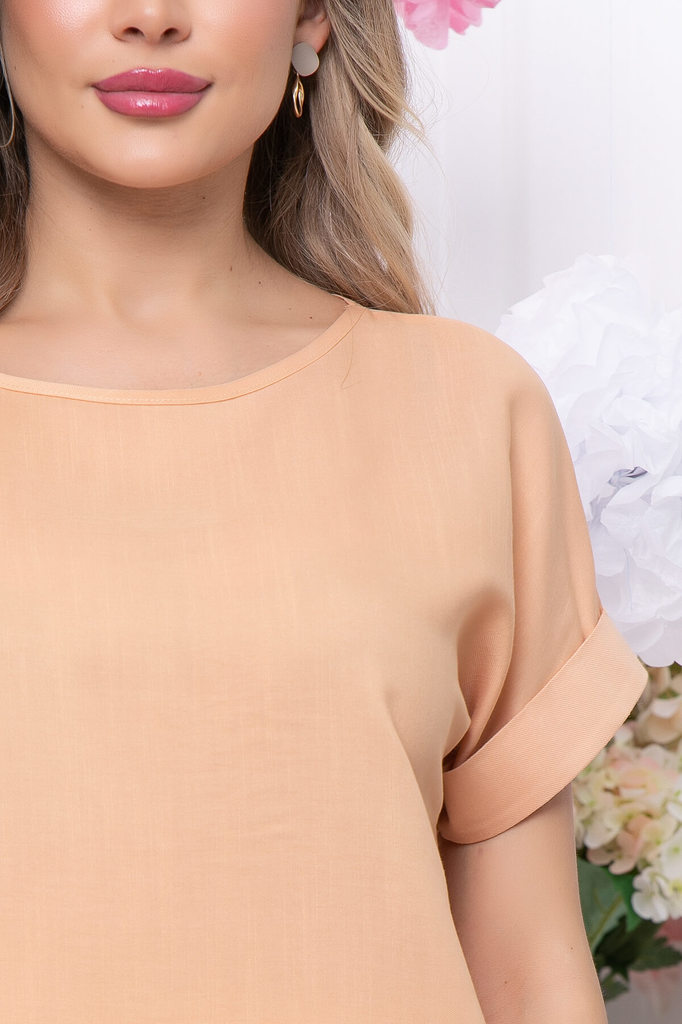 Артикул: Б5809. Ткань: блузочная вискоза. Состав: 70% вискоза, 27% п/э, 3% эластан. Цвет: персиковый. Вид застежки: отсутствует. Силуэт: полуприлегающий. Карманы: отсутствуют. Тип горловины:... Показать описание округлый. Длина изделия по спинке: 46/ 69 см, 48/ 70 см, 50/ 71 см, 52/ 72 см, 54/ 73 см, 56/ 74 см. Рост модели: 168 см. Легкие летние блузы - это тренд теплого времени года. Они точно не оставят без внимания своей оригинальностью и яркостью. Блуза с цельнокроеным рукавом с украшением в виде манжет. В комплект входит пояс из основной ткани, который отлично подчеркнет все преимущества фигуры. Блуза без подклада. Уход за изделием: бережная стирка до 30 градусов; нельзя отбеливать; деликатный отжим; гладить при t не более 110 С; гладить с изнанки. *Допуск отклонения длины при массовом производстве 1-3 см является нормой.