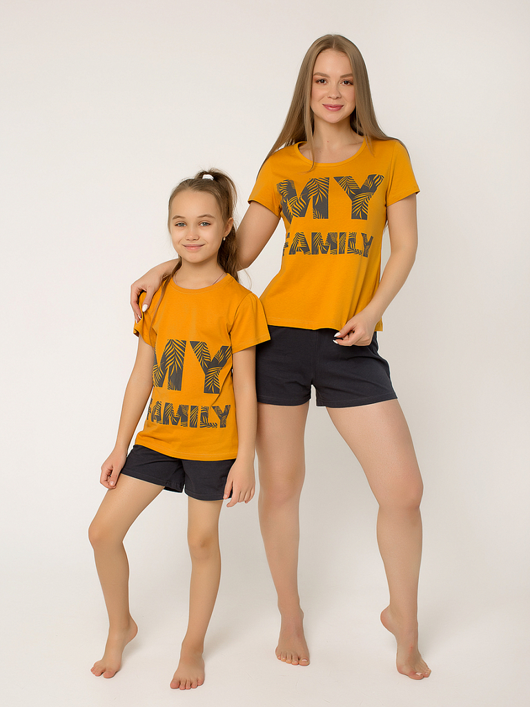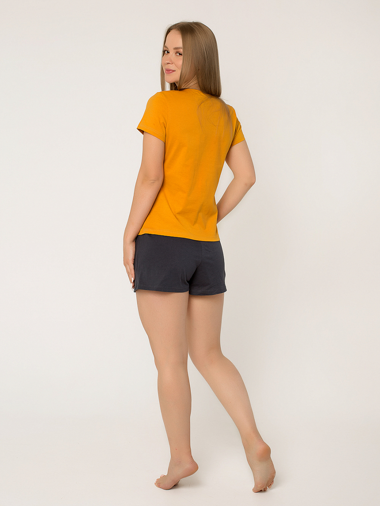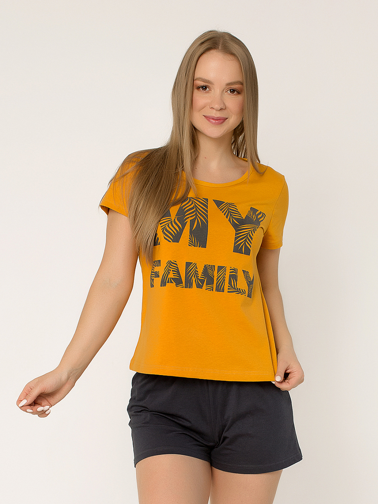 Оригинальный и невероятно лёгкий женский костюм для дома и отдыха из хлопкового полотна Премиум качества, в который Вы определённо влюбитесь! Изделие - полуприлегающего силуэта. Свободные и не стесняю... Показать описаниещие движений шорты с высокой посадкой и футболка также прекрасно подойдут и для ночного отдыха. Необычное цветовое решение графитовых и горчичных тонов сразу привлекает внимание. Женский костюм выполнен в направлении Family Look, поэтому Вы сможете подобрать похожие образы для всей семьи. Характеристики: 100% хлопок премиум; короткий рукав; свободные шорты с высокой посадкой; оригинальное цветовое решение; family look.