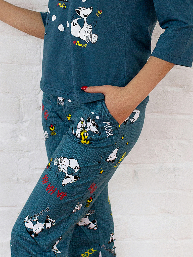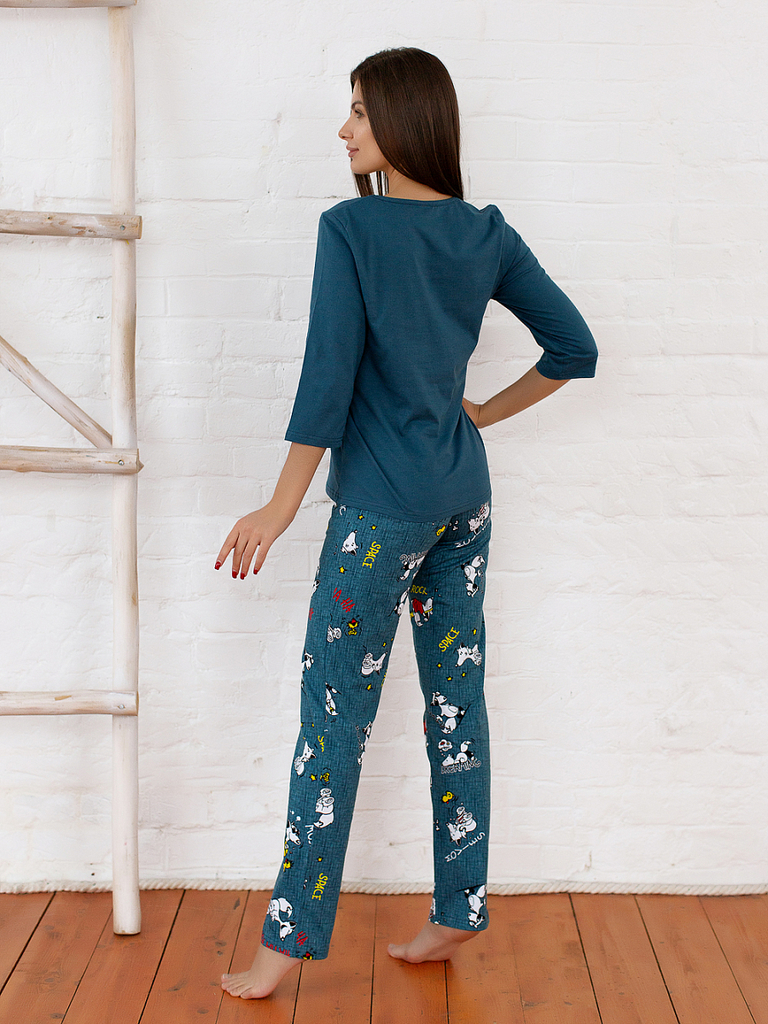 Женская пижама для дома и отдыха из хлопкового полотна Премиум качества, лёгкая, удобная и в то же время невероятно красивая. Пижама - полуприлегающего силуэта, состоит из футболки с рукавом 3/4 и сво... Показать описаниебодных, не стесняющих движений брюк с высокой посадкой и боковыми карманами. Женская пижама выполнена в направлении Family Look (Фэмили лук), поэтому Вы всегда сможете подобрать похожий образ для любимой дочки. Полочку домашнего костюма украшает авторский яркий стилизованный принт с анимационными героями. Характеристики: 100% хлопок; рукав 3/4; брюки с высокой посадкой; боковые карманы; family look (фэмили лук); авторский принт.