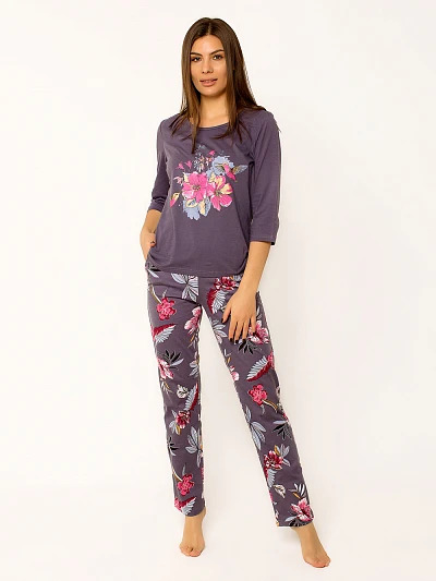 Женская пижама для дома и отдыха из хлопкового полотна высокого качества, лёгкая, удобная и в то же время невероятно красивая. Такую модель можно определённо можно использовать в качестве тёплого дома... Показать описаниешнего костюма. Пижама - полуприлегающего силуэта, состоит из футболки с рукавом 3/4 и свободных, не стесняющих движений брюк с высокой посадкой и боковыми карманами. Благодаря удобному свободному крою и хлопковому приятному материалу она прекрасно подойдёт для осени и зимы и согреет в холодный период времени года. Женская пижама выполнена в направлении Family Look (Фэмили лук), поэтому Вы всегда сможете подобрать похожий образ для любимой дочки. Полочку домашнего костюма украшает авторский яркий стилизованный принт с эффектом золота. Данная модель выполнена в тропическом стиле, а нежные бежевые и коричневые оттенки прекрасно подойдут для осеннего настроения. Характеристики: 100% хлопок; рукав 3/4; брюки с высокой посадкой; боковые карманы; family look (фэмили лук); авторский принт.