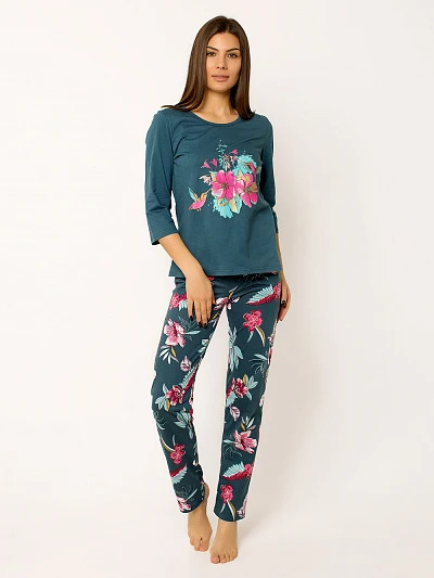 Женская пижама в тропическом стиле для дома и отдыха из хлопкового полотна высокого качества, лёгкая, удобная и в то же время невероятно красивая. Такую модель можно определённо можно использовать в к... Показать описаниеачестве тёплого домашнего костюма. Пижама - полуприлегающего силуэта, состоит из футболки с рукавом 3/4 и свободных, не стесняющих движений брюк с высокой посадкой и боковыми карманами. Благодаря удобному свободному крою и хлопковому приятному материалу она прекрасно подойдёт для осени и зимы и согреет в холодный период времени года. Женская пижама выполнена в направлении Family Look (Фэмили лук), поэтому Вы всегда сможете подобрать похожий образ для любимой дочки. Полочку домашнего костюма украшает авторский яркий стилизованный принт с эффектом золота. Данная модель выполнена в тропическом стиле, а нежные оттенки зелёного и хаки прекрасно подойдут для осеннего настроения. Характеристики: 100% хлопок; рукав 3/4; брюки с высокой посадкой; боковые карманы; family look (фэмили лук); авторский принт.