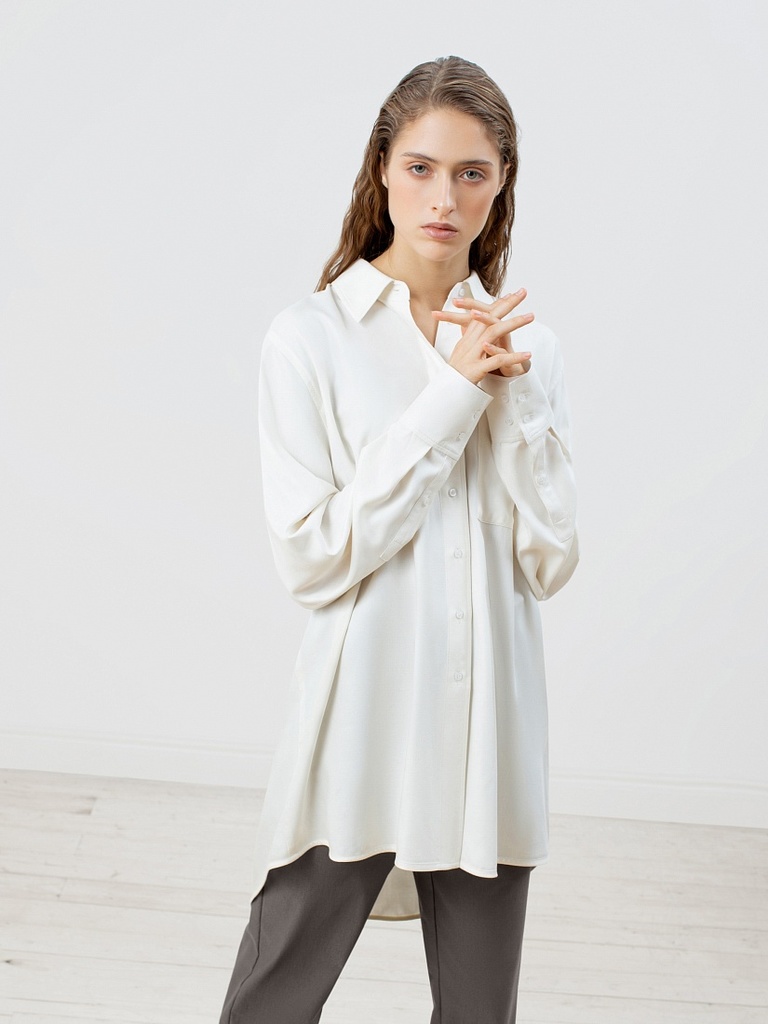 Покрой/Силуэт: прямой Основная ткань: хлопок 70%, полиэстер 27%, эластан 3% Тип воротника: отложной Тип рукава: втачной Стиль: smart casual Вид застежки: пуговицы Рост модели на фото - 175 см. Цвет од... Показать описаниеежды на фотографиях может незначительно отличаться от оригинального. Артикул: Стильная блуза удлинённого прямого силуэта из хлопковой белой ткани с классическим отложным воротником и втачным рукавом полной длины. Спереди декоративная складка и дизайнерская застежка. Низ изделия закругленный, спинка удлинённая. Смотреть видеообзор