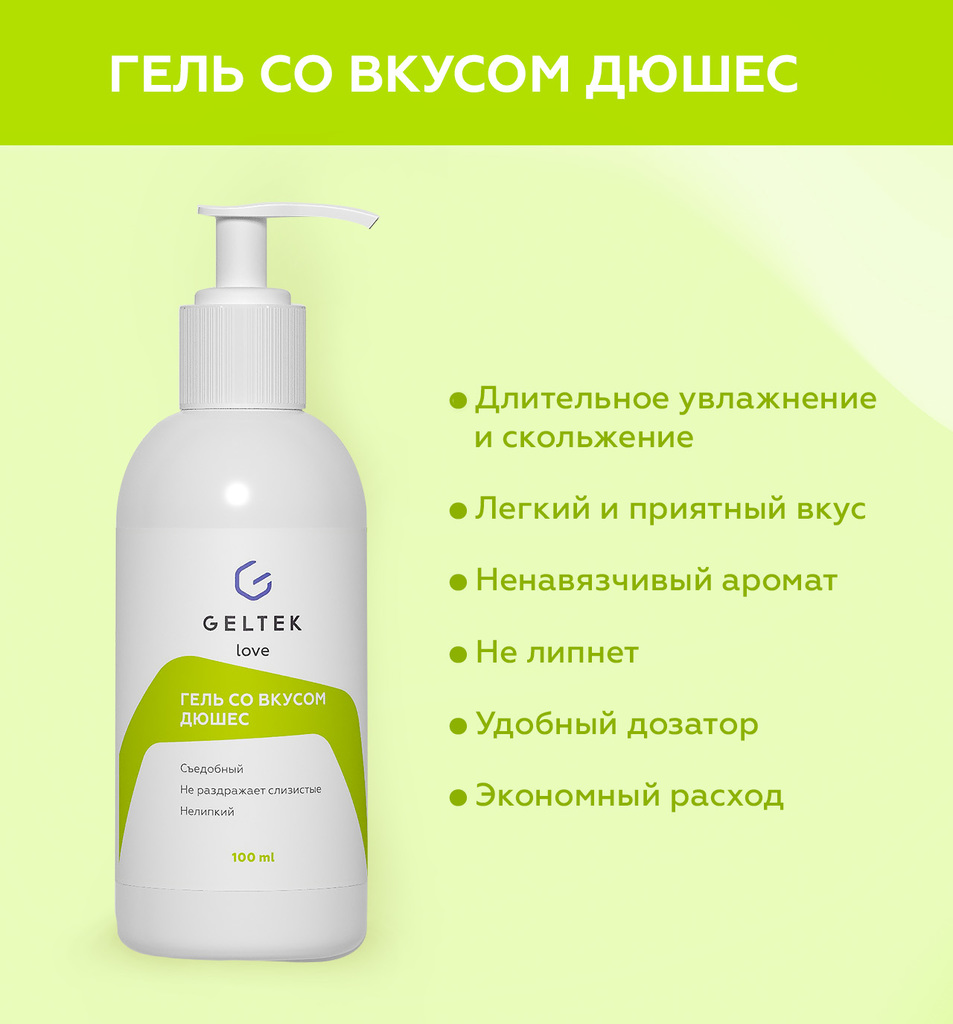 Гель съедобный со вкусом дюшес сделан на водной основе, обладает слабокислым pH (4,4), безопасен для слизистых, не раздражает горло, не оставляет следов на одежде и белье, легко смывается водой. Не ос... Показать описаниетавляет послевкусия. Подходит для диабетиков, веганов и людей, следящих за диетой и питанием (всего 13 калорий на 100 г). Совместим с различными видами контрацепции и игрушками для взрослых. Большой флакон объемом 100 мл снабжен удобным дозатором. Состав: вода очищенная, сорбитол, гидроксиэтилцеллюлоза, лимонная кислота, бензоат натрия, сорбат калия, ароматизатор пищевой, краситель пищевой.