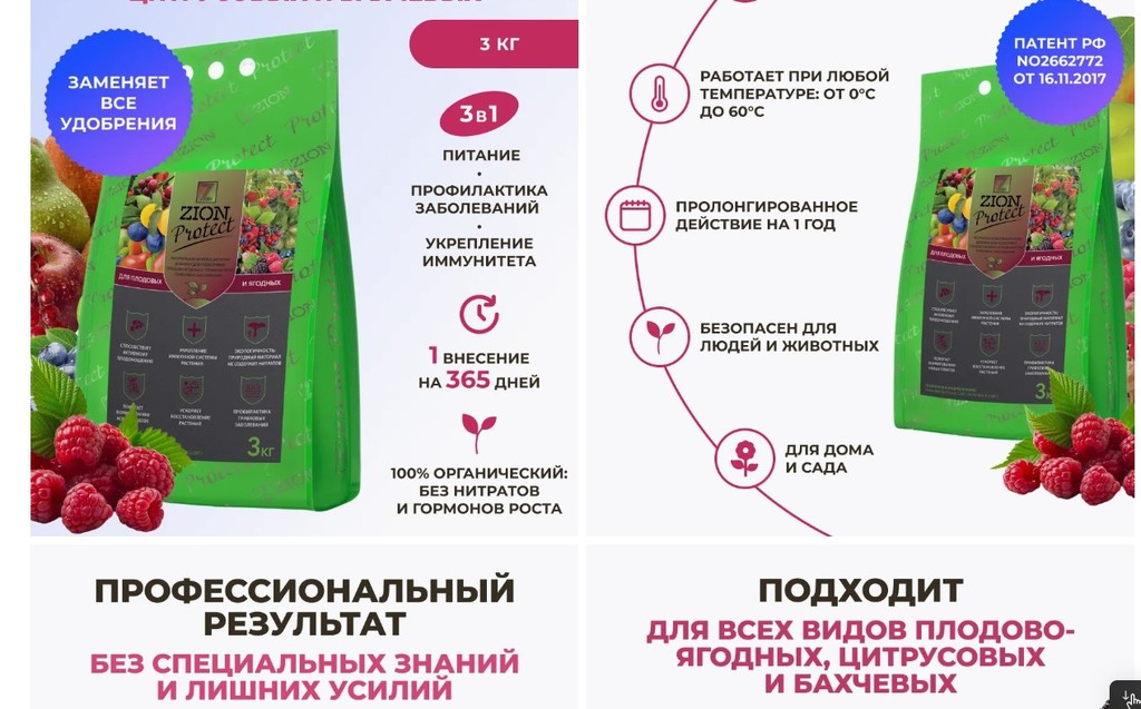 ТЕХНОЛОГИЯ ИОНИТОПОНИКИ Патенты РФ №2662772 от 16.11.2017 г., №2762136 от 16.12.2021 г. Натуральная инновационная питательная добавка ЦИОН ПРОТЕКТ для подкормки растений обеспечивает их интенсивный ро... Показать описаниест, развитие сильной корневой системы, повышает урожайность зеленных, овощных и плодово-ягодных культур, сокращает сроки созревания урожая. Способствует длительному цветению садовых цветов. Препятствует развитию грибковой микрофлоры в грунте. ЦИОН ПРОТЕКТ может использоваться в течение всего садового сезона в виде корректирующих добавок к почвам любого состава, в том числе к обеднённым и деградированным грунтам, пескам, истощенным разбалансированным почвам и др. Обеспечивает профилактику грибковых инфекций (парша, ризоктониоз, фитофтороз и др.) и сбалансированное питание растений в течение всего садового сезона Содержит в 30 раз больше питательных элементов, чем самый плодородный грунт. Изготовлен на основе природных минералов, экологически безопасен. Не является минеральным удобрением, не содержит нитратов, синтетических фунгицидов, ускорителей роста и фитогормонов. Способствует легкой адаптации растений после пересадки. Рекомендован для прямого контакта с корневой системой. Способы применения Для подкормки однолетних растений: внесите 2 столовые ложки питательной добавки ЦИОН ПРОТЕКТ по кругу посадочной ямы куста, прикапывая на глубину 5-7 см. Присыпьте землей и полейте водой. Подкормку растущих растений рекомендуется производить в период с мая по сентябрь включительно. Для подкормки растущих многолетних растений: По периметру приствольного круга растения вращательными движениями заостренным колышком сделайте проколы глубиной 30-40 см под наклоном 45 градусов, стараясь не повредить корневую систему. Внесите необходимо количество ЦИОН ПРОТЕКТ в проколы и присыпьте землёй. Расход добавки для подкормки многолетних растений зависит от их возраста и размера. Например, для саженца высотой до 1 м расход ЦИОН ПРОТЕКТ - 300-400 г, для саженца высотой от 1 до 2,5 м - 700-1000 г, а при подкормке взрослых кустарников и деревьев выше 2,5 м - 1,5-2,0 кг на каждое дерево. Подкормку можно производить в течение всего садового сезона до наступления заморозков. Состав: смесь природных углеродных материалов и ионообменных активных цеолитов Условия хранения: хранить в сухом месте. Срок годности: не ограничен. Содержание основных элементов питания, мг/кг: Азот (N) 2 500 Фосфор (P2O5 ) 2 300 Калий (K2O) 2 800 Ограничений по количеству вносимой добавки нет. Внесение большего количества позволит только повысить эффективность ее работы и продлить срок полезного действия.