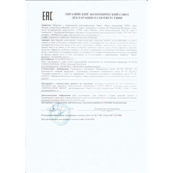 Дата изготовления: 20.08.2024 Срок годности: 20.02.2026 Традиционная греческая сладость: лукум ручной работы с добавлением миндаля, кокоса, лимона и розы. Состав: Сахар, сироп глюкозы, кукурузный крах... Показать описаниемал, вода, различные ароматизаторы. Сгуститель: лимонная кислота. Пищевые красители: Е110, Е122, Е140. Может содержать следы сухих орехов и/или кунжута. Пищевая ценность на 100г: Энергетическая ценность 332 кКал / 1394,4 КДж. Белки 0г Углеводы 82.5г Жиры 0г Сахара 80г Соль 0г. В упаковке содержится 10 порций. Условия хранения Хранить в сухом прохладном месте. Вес нетто: 200 г. Вес брутто: 240 г. Произведено и упаковано: S.Kandylas S.A., 6th Veria - Naoussa, Греция.