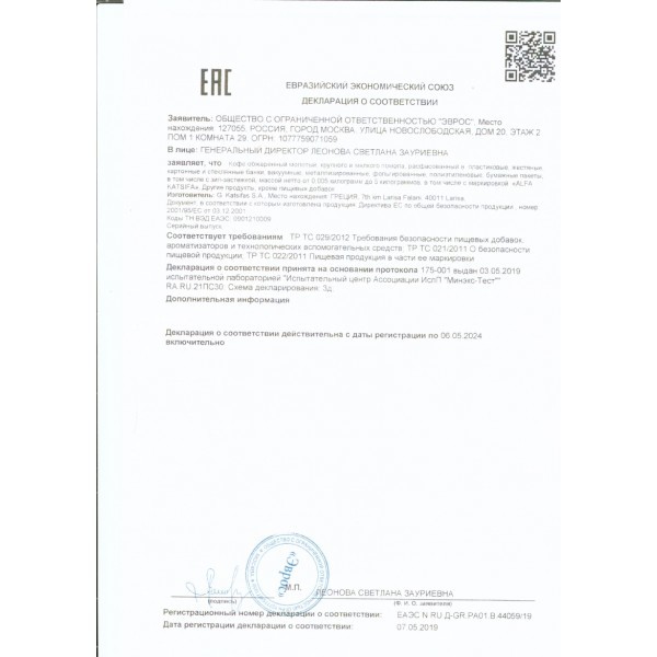 Дата изготовления: 19.10.2023 Срок годности: 31.10.2026 Традиционный молотый греческий кофе Альфа Катсифа (Alfa Katsifa). Представляет собой выверенный годами вкус, аромат и крепость кофе, любимого гр... Показать описаниееками северных областей. Состав: 100% молотый кофе. Не содержит консервантов. Способ приготовления 1 порции В турку насыпать 1 чайную ложку кофе, 1/2 чайной ложки сахара, залить все кофейной чашечкой холодной воды. Варить, помешивая, на медленном огне до образования густой пены. Не доводить до кипения. Пищевая ценность в 100г продукта: Энергетическая ценность - 118,7 кКал / 485 кДж. Белки: 15г. Жиры: 3,6г. Углеводы: 7г. Условия хранения Хранить в прохладном сухом темном месте. Производитель: G.Katsifas S.A., 7th km LarisaFalani, 40011 Laris, Греция. Вес нетто: 76г. Вес брутто: 80г. Продукт упакован в защищенной атмосфере.