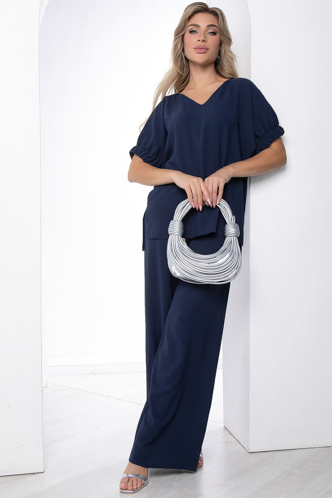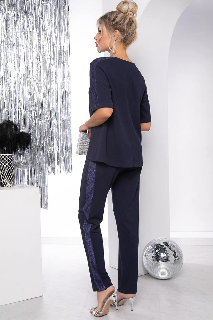 Артикул: К7912. Ткань: трикотаж "Скуба", трикотаж с люрексом. Состав: 95% п/э, 5% эластан. Цвет: темно-синий. Вид застежки: без застёжки. Силуэт: свободный. Карманы: отсутствуют. Тип го... Показать описаниерловины: округлый. Длина изделия блуза по спинке: 44/ 60 см, 46/ 60 см, 48/ 61 см, 50/ 61 см, 52/ 62 см, 54/ 65 см. Длина брюк с учётом резинки: 44-54/ 100 см. Рост модели: 168 см. Костюм-двойка, состоящий из брюк на резинке и блузы свободного кроя. Очень удобный комплект для стильной вечеринки. Если Вы хотите чувствовать себя комфортно на корпоративном вечере или праздничном мероприятии, выбирайте брючный костюм! При желании подчеркнуть талию, верх можно заправить. Блуза свободного кроя, округлый вырез горловины, рукав втачной, укороченный. Брюки прямого кроя, по талии на комфортной резинке. Уход за изделием: ручная стирка до 30 градусов; нельзя отбеливать; деликатный отжим; гладить при t не более 110 С; гладить с изнанки. *Допуск отклонения длины при массовом производстве 1-3 см является нормой.