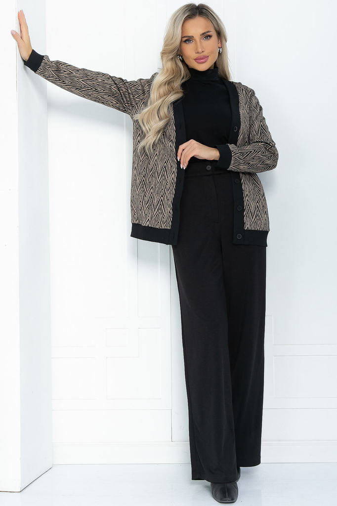 Артикул: П4862. Ткань: костюмная. Состав: 88% п/э, 12% эластан. Цвет: брауни, чёрный, бежевый. Принт: гусиная лапка (брауни). Вид застежки: жакет на пуговицах. Силуэт: полуприлегающий. Карма... Показать описаниены: в боковых швах брюк, в боковых швах жакета. Длина изделия жакет по спинке: 44/ 57 см, 46/ 59 см, 48/ 60 см, 50/ 61 см, 52/ 62 см, 54/ 63 см. Длина брюк с учётом резинки: 44/ 99 см, 46/ 99 см, 48/ 100 см, 50/ 100 см, 52/ 100 см, 54/ 100 см. Рост модели: 168 см. Костюм-двойка, состоящий из брюк прямого кроя с высокой посадкой на резинке и жакета свободного кроя. Преимущество комплекта в том, что вы сможете самостоятельно носить как жакет, так и брюки. В повседневном образе смело сочетайте с лоферами или ботинками, а если нужен более официальный образ, с туфлями на каблуке. Уход за изделием: бережная стирка до 30 градусов; нельзя отбеливать; деликатный отжим; гладить при t не более 110 С; гладить с изнанки. *Допуск отклонения длины при массовом производстве 1-3 см является нормой.