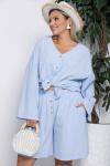 Артикул: К8681. Ткань: полулён. Состав: 40% полиэстер, 27% вискоза, 23% лен, 10% хлопок Цвет: голубой. Вид застежки: на рубашке - пуговицы, на шортах - отсутствует (имитация). Силуэт: свободный. ... Показать описаниеКарманы: есть. Длина изделия рубашка по спинке: 46/ 61 см, 48/ 62 см, 50/ 63 см, 52/ 64 см. Длина шорт с учётом резинки: 46/ 46 см, 48/ 47 см, 50/ 48 см, 52/ 49 см. Рост модели: 170 см. Лето все ближе! Настало время лёгких костюмов! На пике популярности в этом сезоне комплект из свободной рубашки и шорт. Рубашка свободного кроя на пуговицах. Рукав широкий, длинный. Шорты классические на резинке. Уход за изделием: бережная стирка до 30 градусов; нельзя отбеливать; деликатный отжим; гладить при t не более 110 С; гладить с изнанки. *Допуск отклонения длины при массовом производстве 1-3 см является нормой.
