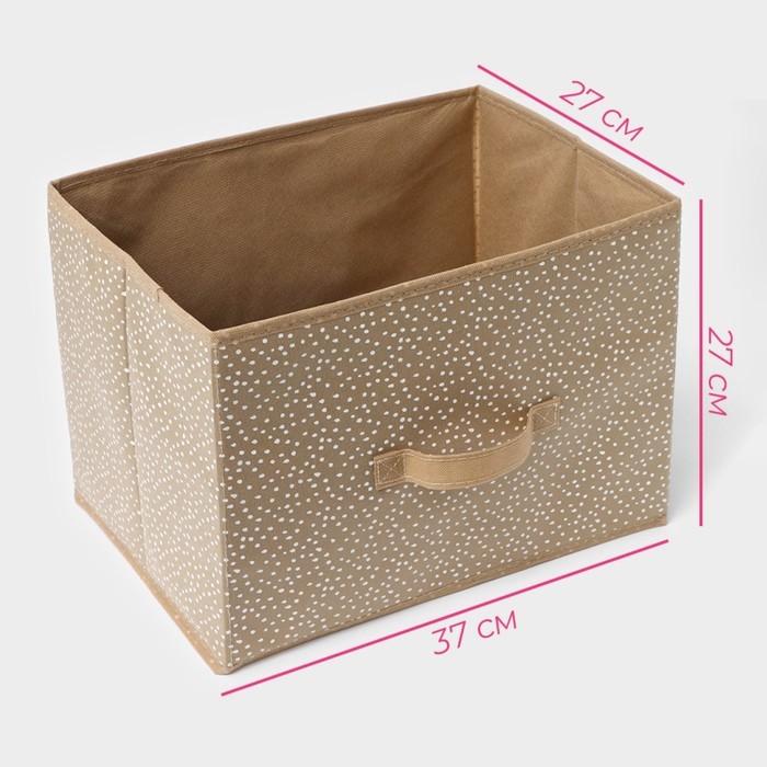 Представляем вам короб для хранения, который станет отличным помощником в поддержании порядка в вашем доме. С размерами 29х29х18 см и привлекательным серым цветом с узором "ромбы", этот короб идеально... Показать описание подойдет для хранения одежды, рукоделия и других необходимых вещей, придавая вашему пространству стильный вид. Выполненный из прочного флизелина, короб имеет квадратную форму и одну вместительную секцию, что делает его универсальным и удобным в использовании. Отсутствие крышки обеспечивает быстрый доступ к содержимому, а наличие ручки облегчает перемещение и транспортировку. * Эстетика и функциональность: стильный серый цвет и узор делают короб не только практичным, но и стильным элементом интерьера. * Универсальность: подходит для хранения одежды, аксессуаров, предметов рукоделия и многих других вещей. * Простой доступ: отсутствие застёжки и наличие ручки позволяют быстро находить нужные вещи и легко переносить короб. * Качество материалов: флизелин обеспечивает долговечность и устойчивость к износу, делая короб надежным выбором. * Оптимальные размеры: квадратная форма и размеры 29х29х18 см идеально вписываются в любую обстановку, от шкафа до стеллажа. Выбор этого короба для хранения — это шаг к упорядоченному и стильному пространству, где каждая вещь всегда под рукой. Поддержите порядок и создайте уют с помощью этого функционального решения! Комплектация * Короб — 1 шт. Дополнительно Уход и условия эксплуатации: * Важно: не рекомендуется стирать изделие в стиральной машинке. * Рекомендуется сухая чистка. * Предназначено для бытового использования.