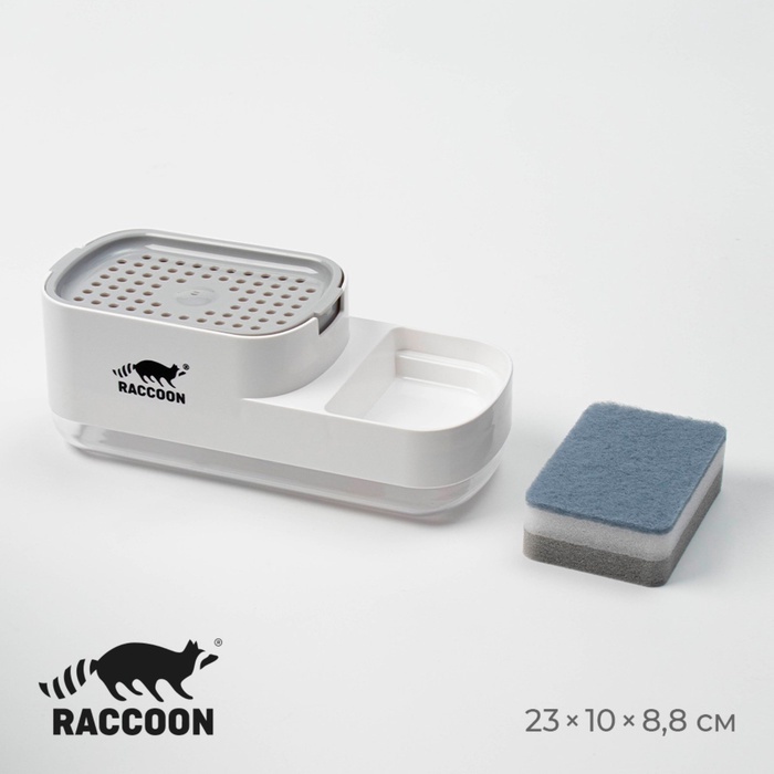 Дозатор для моющего средства с подставкой для губки Raccoon, 550 мл, губка в комплекте, белыйДозатор для моющего средства с подставкой для губки Raccoon, 550 мл, губка в комплекте, белыйДозатор для моющего средства с подставкой для губки Raccoon, 550 мл, губка в комплекте, белый